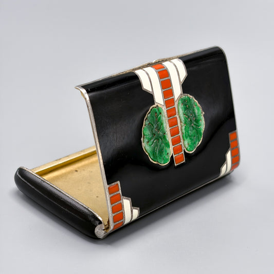 Estate Art Deco 935 Silver and Enamel Calling Card Case with Inlayed Carved Jade
