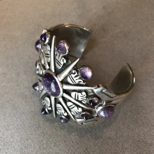 William Spratling Sterling Silver Aztec Sun Cuff with Amethyst