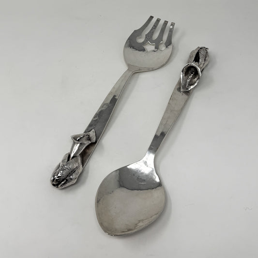 Estate Lona P. Schaeffer Sterling Silver Large Serving Fork and Spoon Set with Leaf Handle