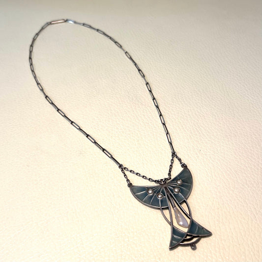 Estate Heinrich Levinger Silver Jugendstil Pendant with Plique a Jour and Pearl Art Nouveau Necklace