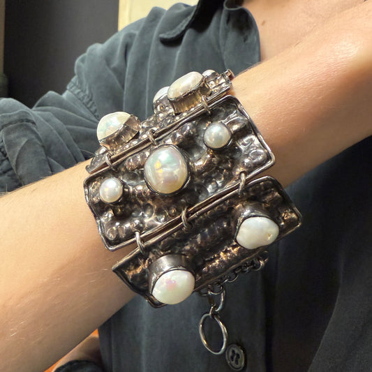 Estate Sterling Silver Brutalist Style South Sea Baroque Pearl Toggle Bracelet