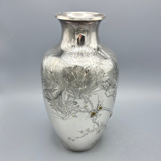 Estate Sterling Silver Japanese Large Vase with Applied Brass Blossoms