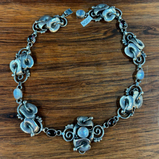Estate Sterling Silver Arts & Crafts Necklace with Moonstone and Garnet Cabochons