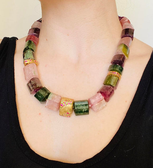 Natural Tourmaline Necklace with 18K Gold Segments with Pave Set Sapphires by Walter Dickhaut