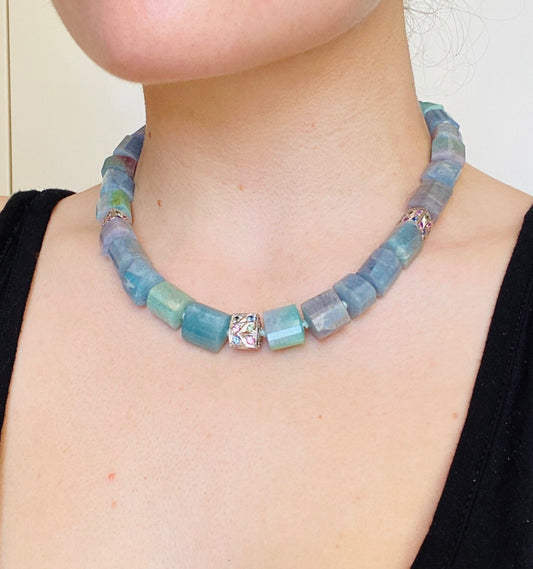 Natural "Paraiba" Tourmaline Chrystal Necklace with 18K White Gold and Sapphires by Walter Dickhaut