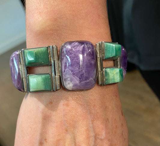 Sterling Silver Bracelet with Amethyst and Green Stone