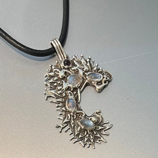 Sterling Silver Brutalist "Sea Urchin" Pendant with Moonstone and Amethyst