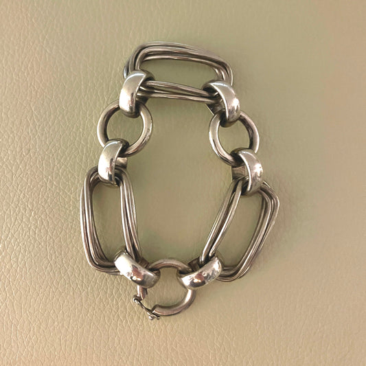 Estate French Silver Bracelet with 3-ring and Double-wire Rectangle Links
