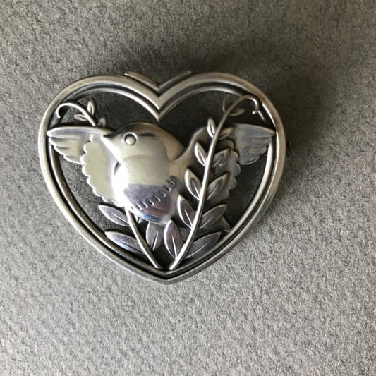 Estate Georg Jensen Sterling Silver Heart And Bird Brooch by Arno Malinowski No. 239