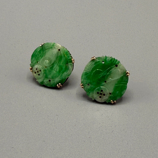 Estate Certified Jadeite Carved Pendants with 14kt Gold Bezels Earrings