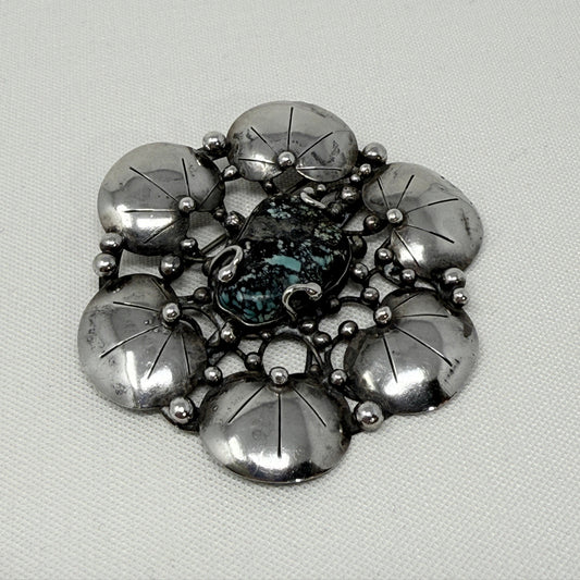 Mary Gage Sterling Silver and Spider Turquoise Round Brooch