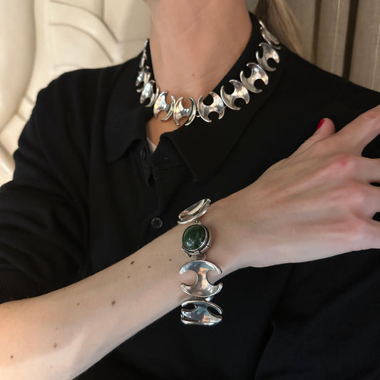 Estate Georg Jensen Sterling Silver Modernist Necklace with Green Stone by Henning Koppel No. 130B