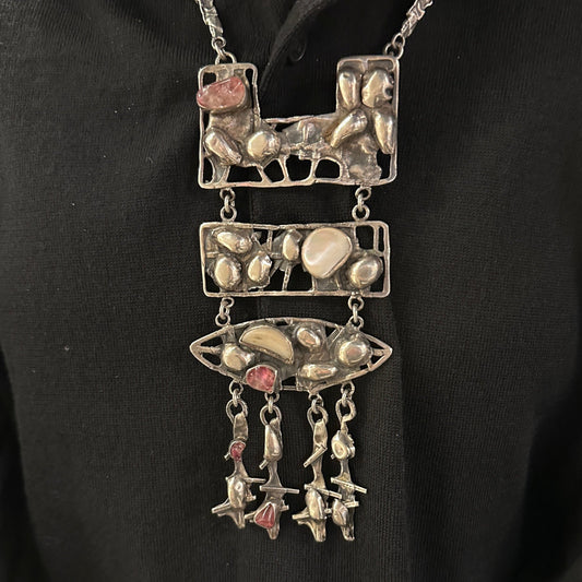 Estate Sterling Silver Brutalist Necklace with Tourmaline and Mother of Pearl by Rachel Gera
