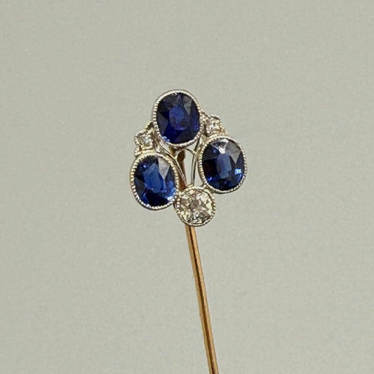Estate Platinum and Yellow Gold Edwardian Three Sapphire and Three European Diamond Stick Pin