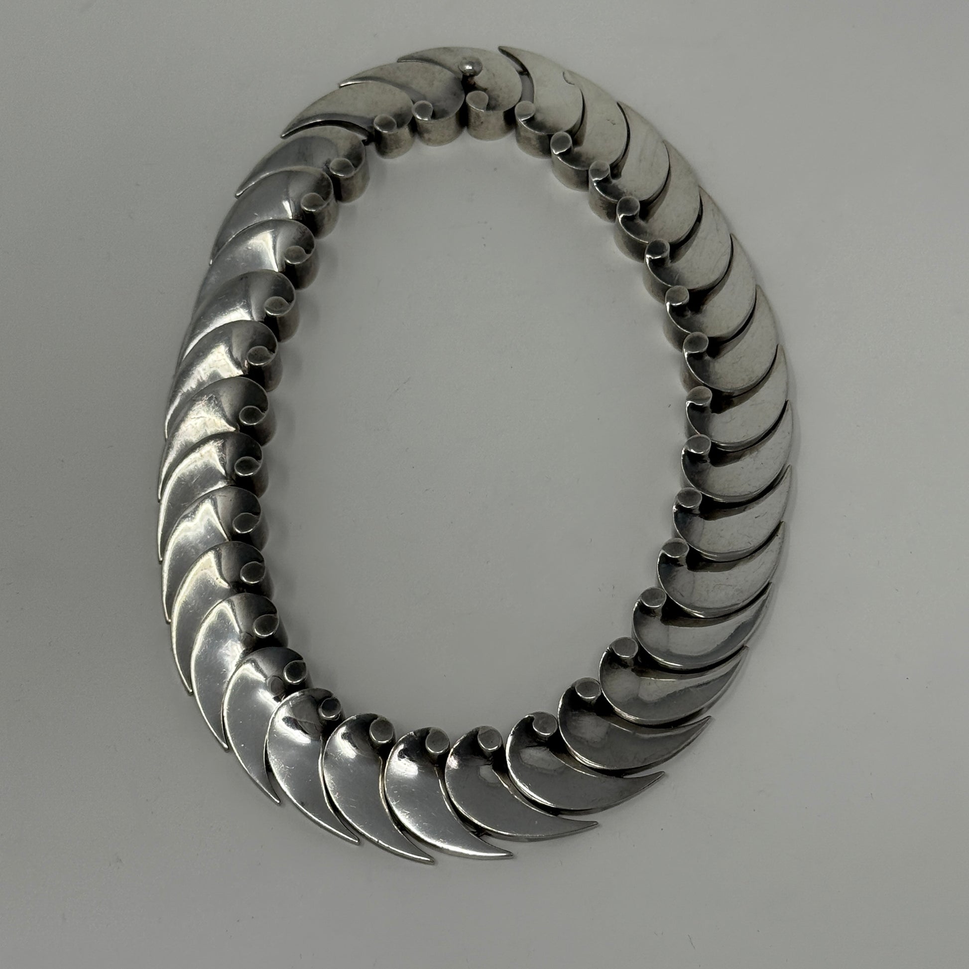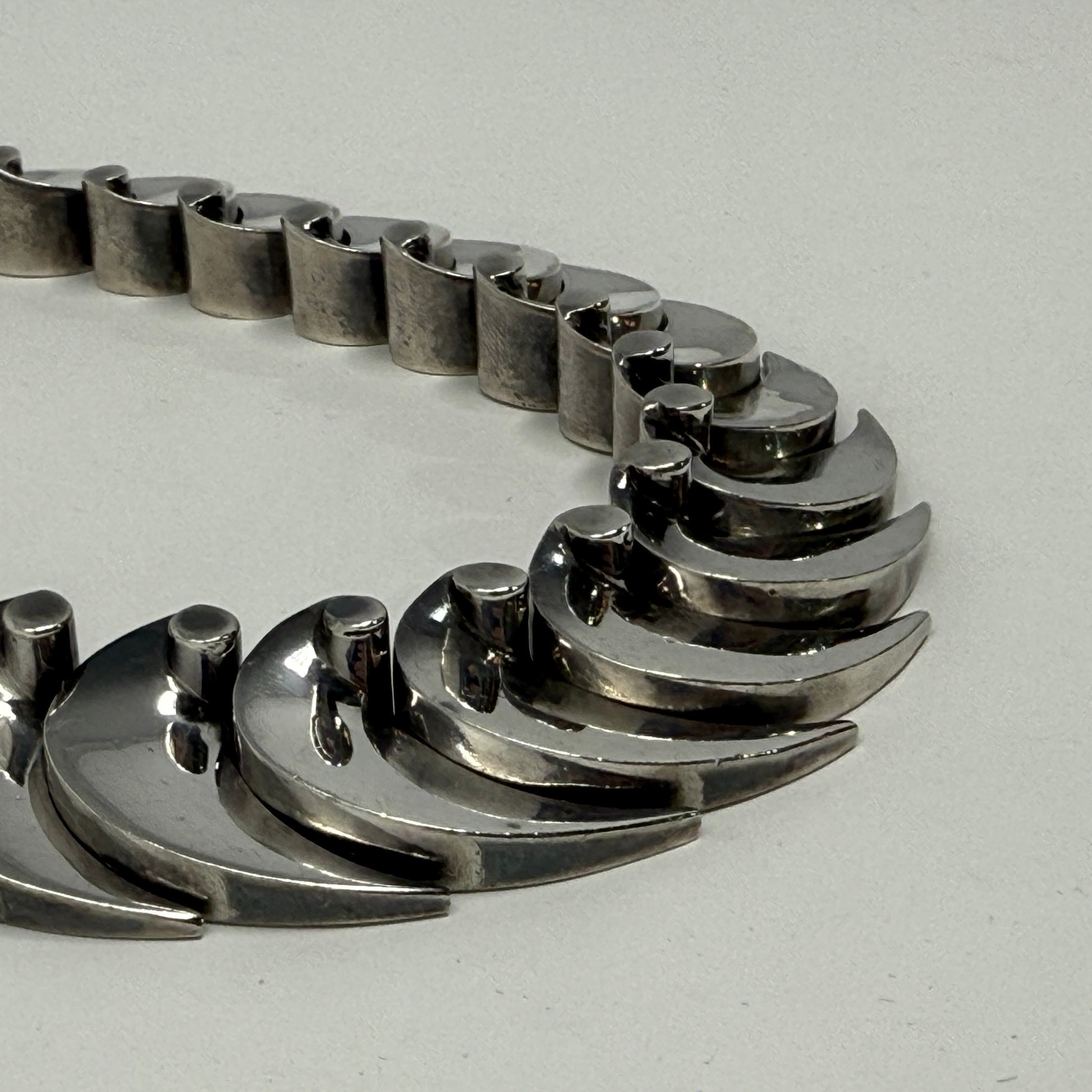 Extremely rare design. "Waves" of silver overlay one another to create a striking statement piece. True to Pineda's pieces, the design wears beautifully around the neck.