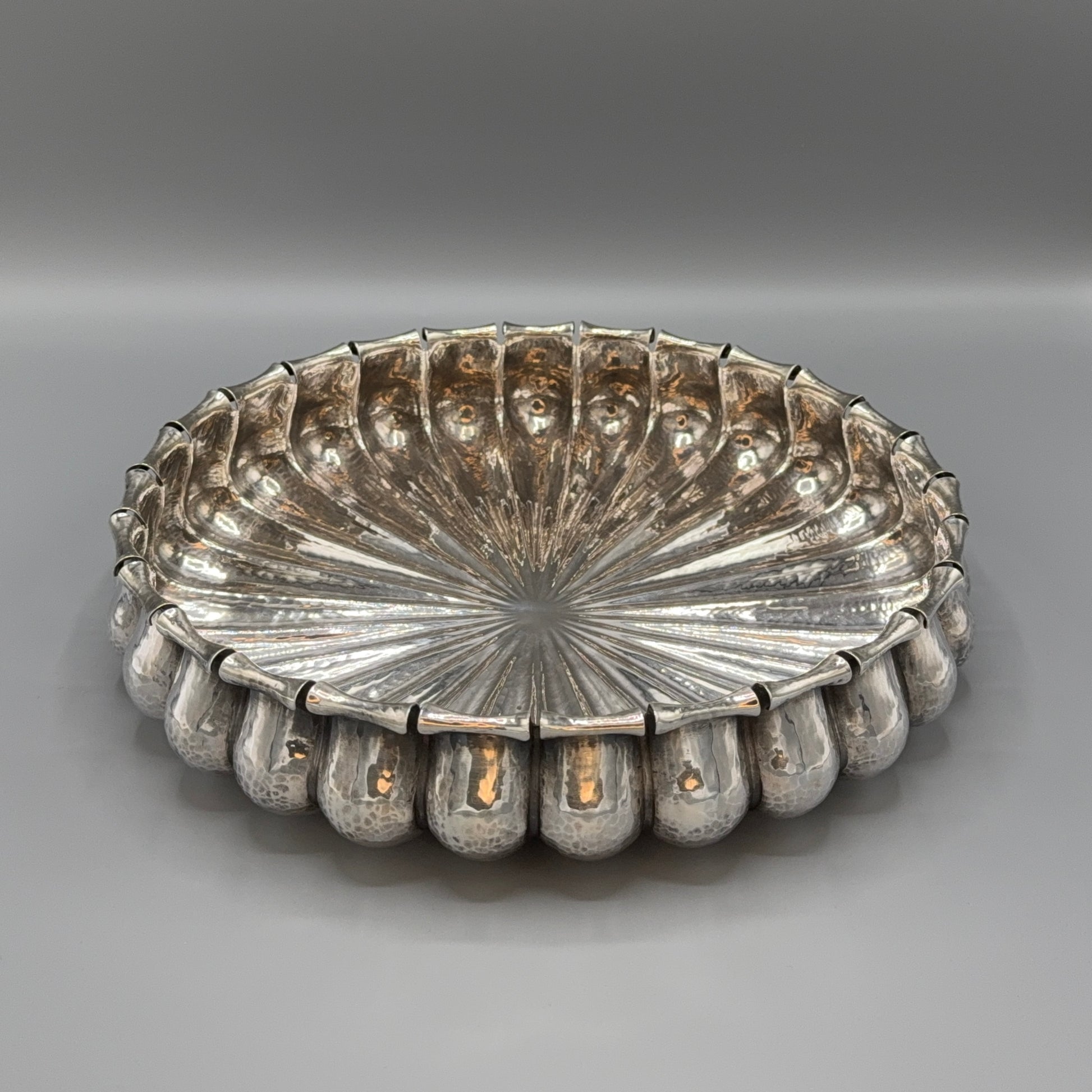 Ideal for serving seafood, displaying fruit, or as an ornamental piece. Features finely crafted scallop detailing that highlights its exquisite design.