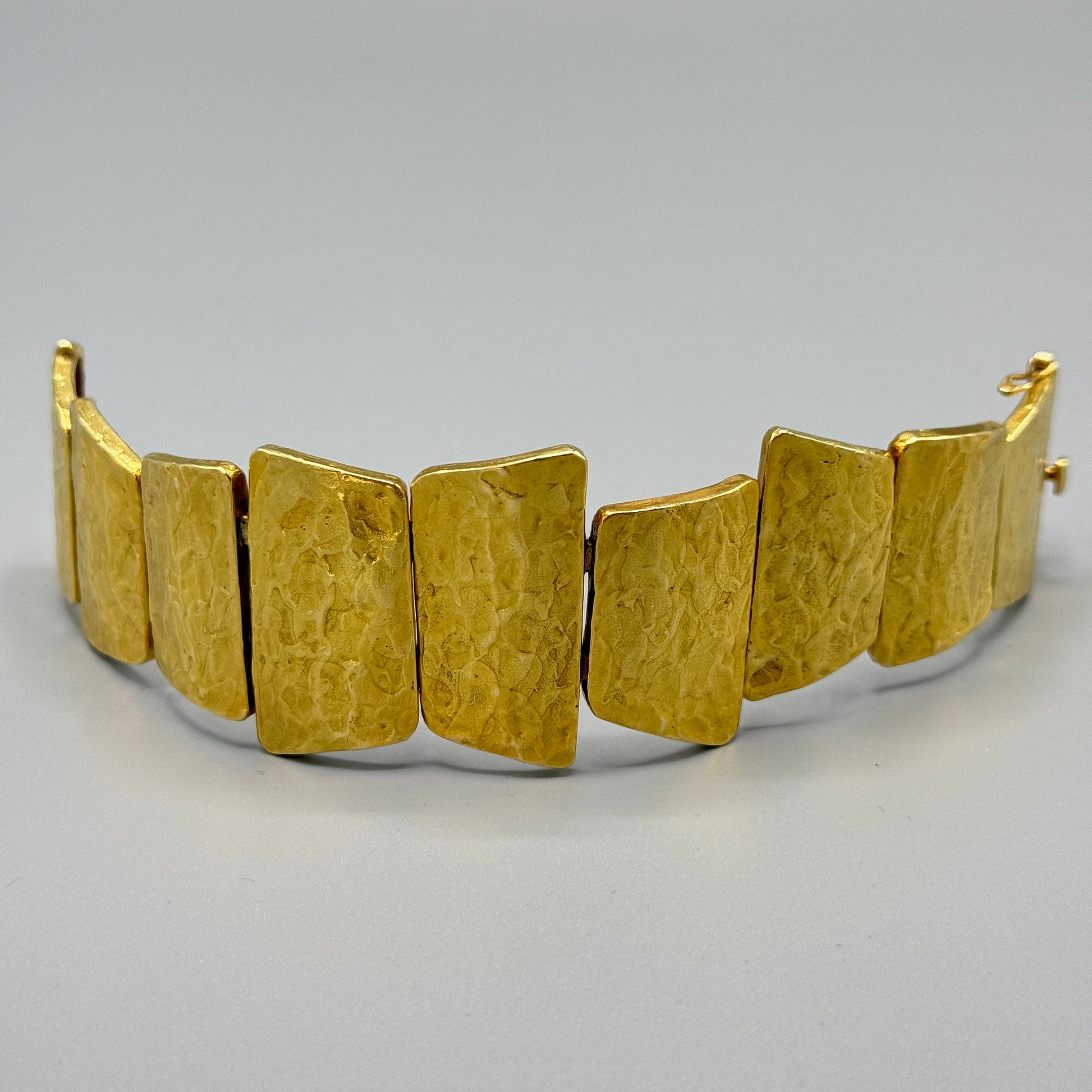 Crafted by renowned artisan Ed Weiner, this estate bracelet showcases the hallmarks of fine jewelry craftsmanship. Each segment and link is individually hand-wrought and hammered from solid 18kt gold, creating a distinctive textured surface that catches light beautifully. The substantial construction and meticulous attention to detail reflect Weiner's mastery of metalworking techniques. A timeless piece that combines artistic integrity with enduring elegance.
