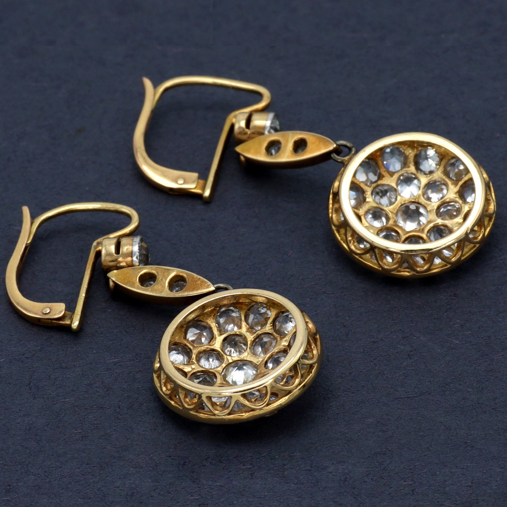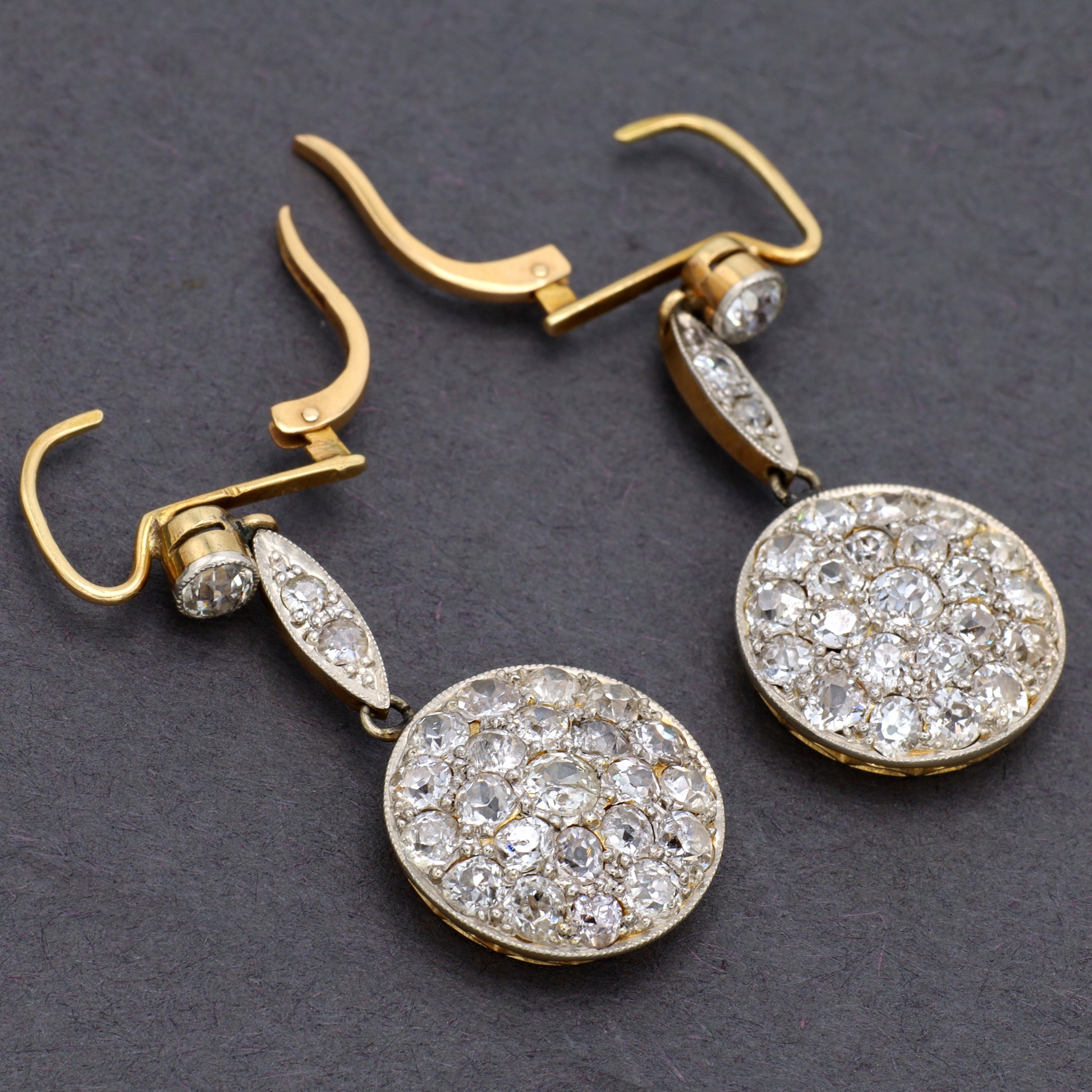 These refined lever-back earrings showcase the timeless elegance of the Edwardian era, featuring exquisite old mine-cut diamonds set in a sophisticated blend of platinum and 18KT yellow gold. The circular drop design creates a graceful silhouette that catches light beautifully, while the warm glow of the gold complements the brilliant sparkle of the diamonds. Designed for pierced ears, these heirloom-quality pieces exemplify classic luxury and enduring style.