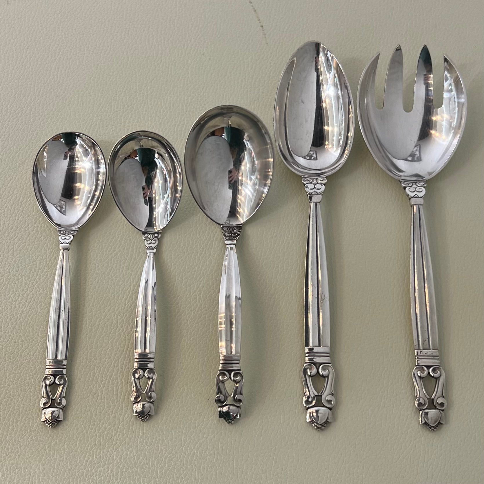 Classic and highly coveted Georg Jensen "Acorn" pattern sterling silver flatware designed by prominent Jensen designer Johan Rohde.