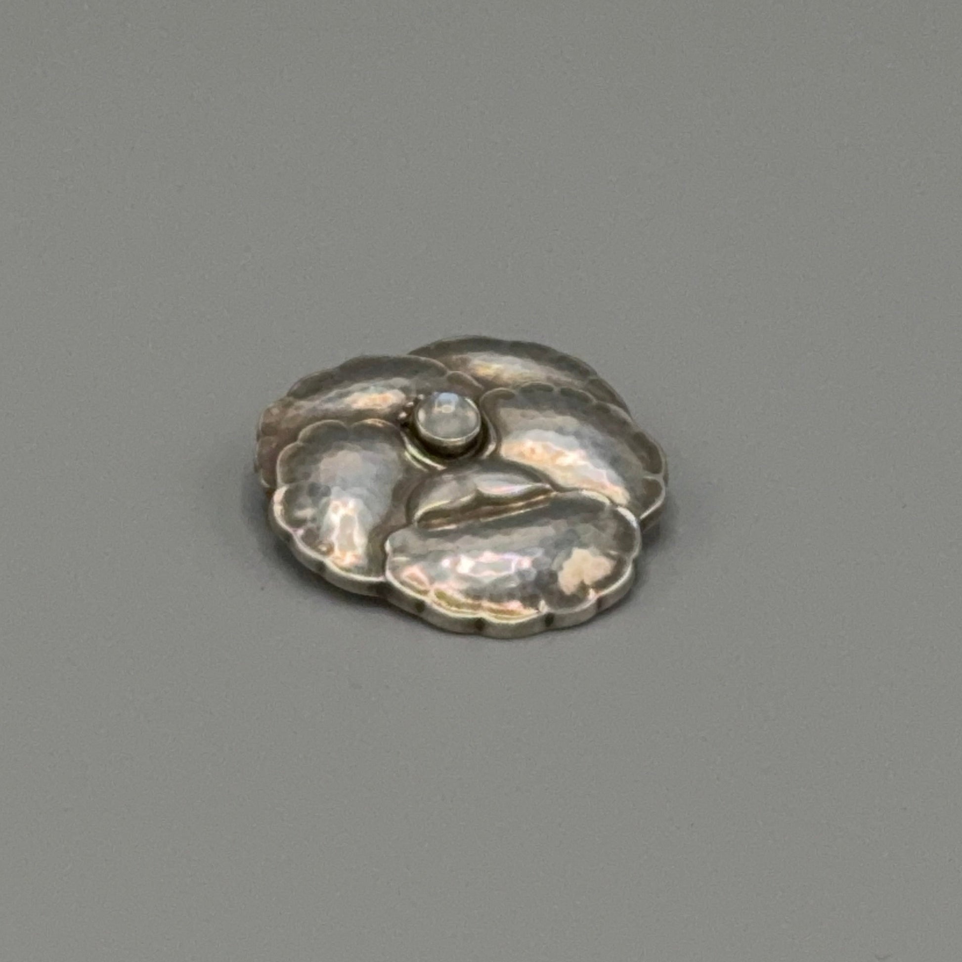 Exquisite "Pansy" brooch featuring a moonstone cabochon centerpiece. Expertly hand-hammered, showcasing a refined patina.