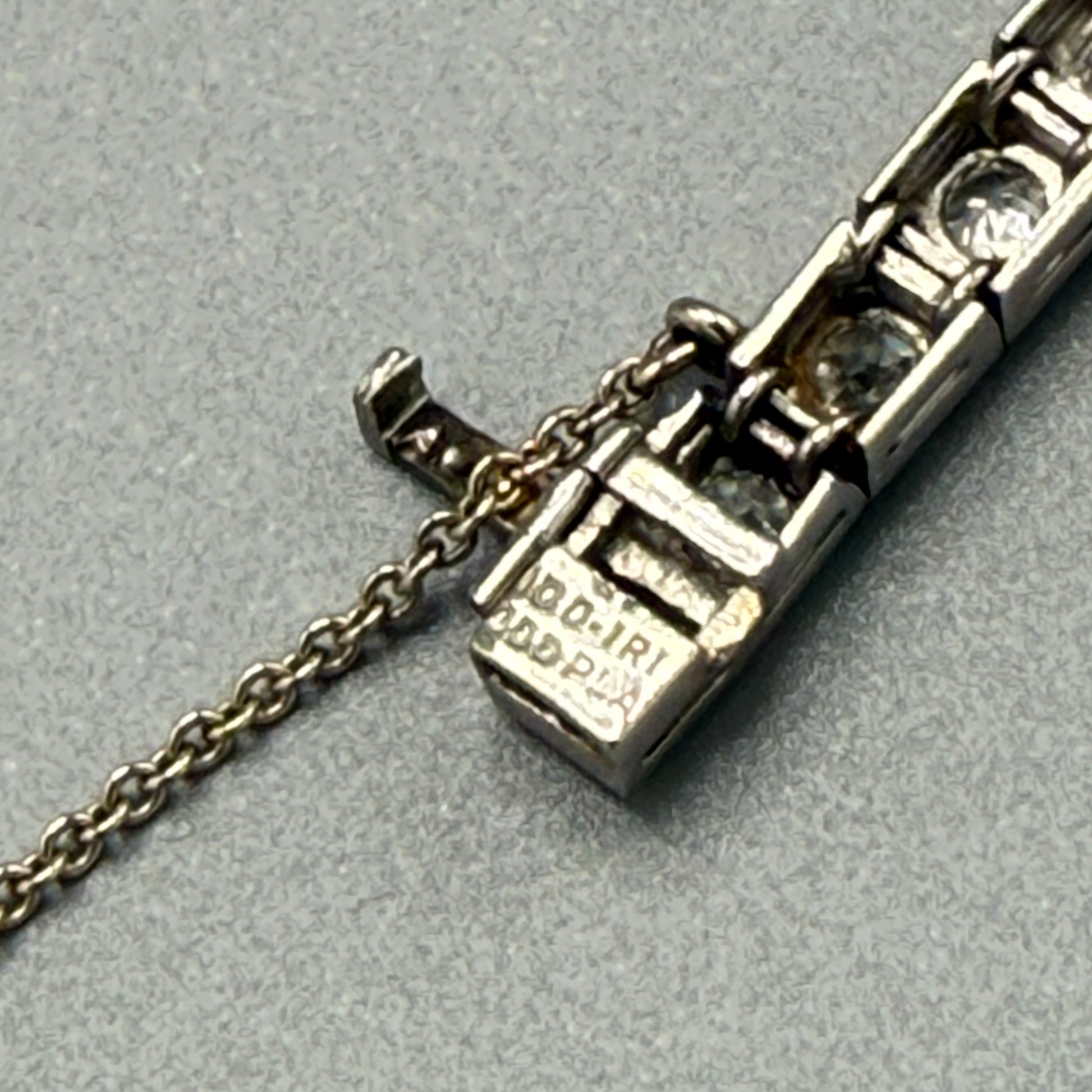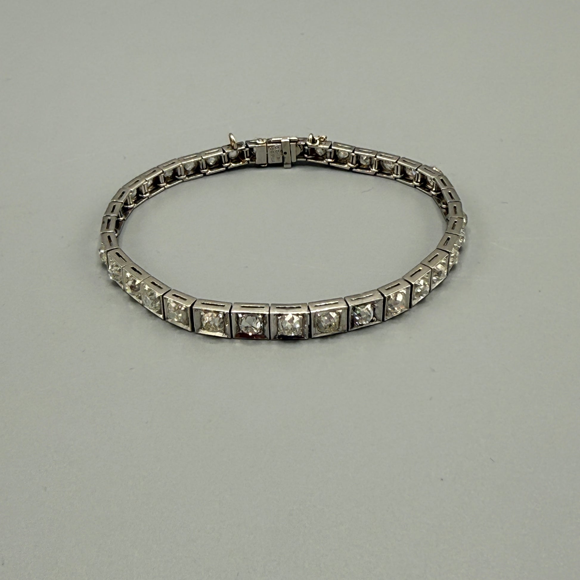 This refined tennis bracelet showcases 9 carats of European cut diamonds set in graduated bezels, exemplifying the geometric elegance characteristic of Art Deco design. Each stone is meticulously secured, creating a seamless flow of brilliance along the wrist. A distinguished piece that combines historical craftsmanship with timeless sophistication.