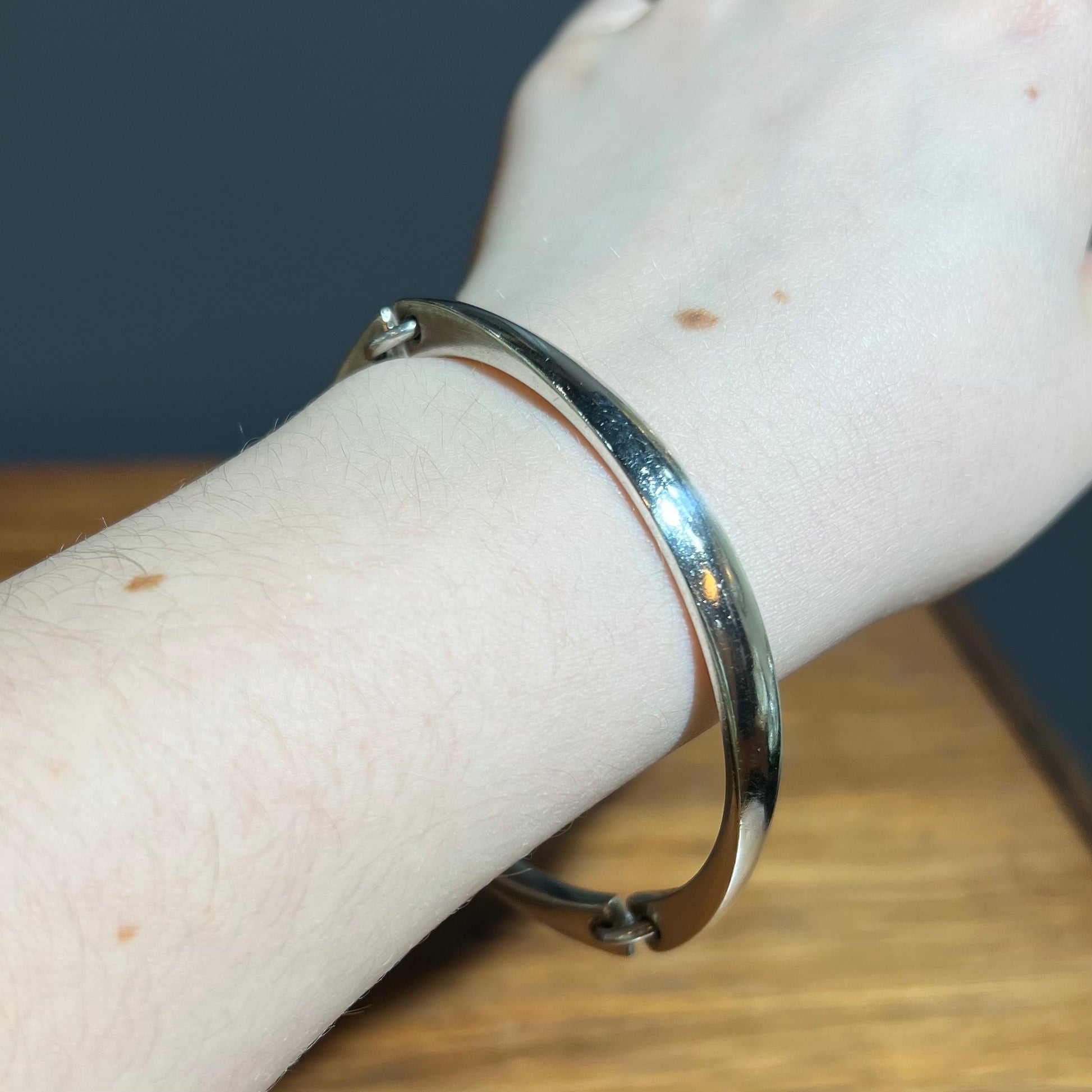 Solid sterling silver hinged bangle with tapered segments.