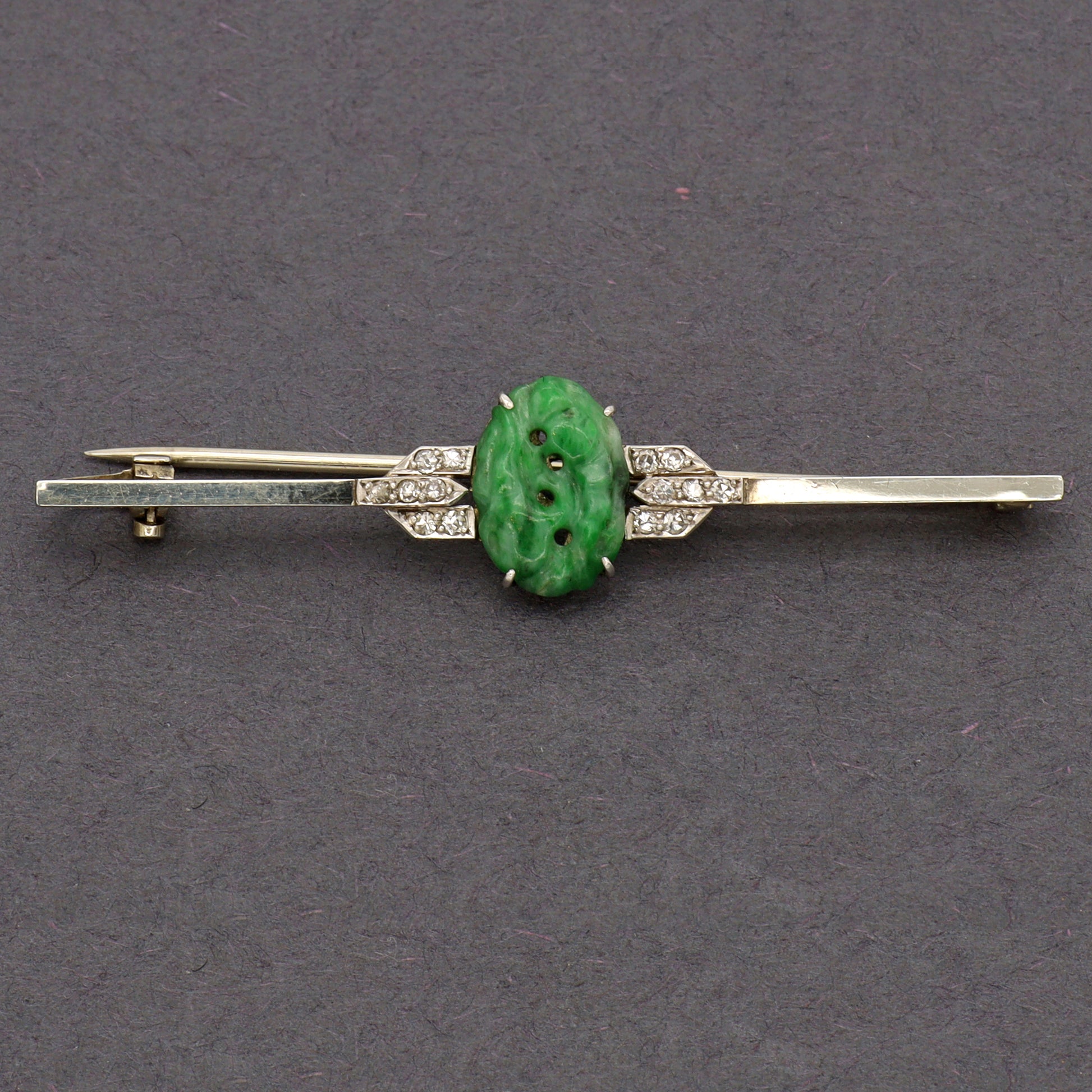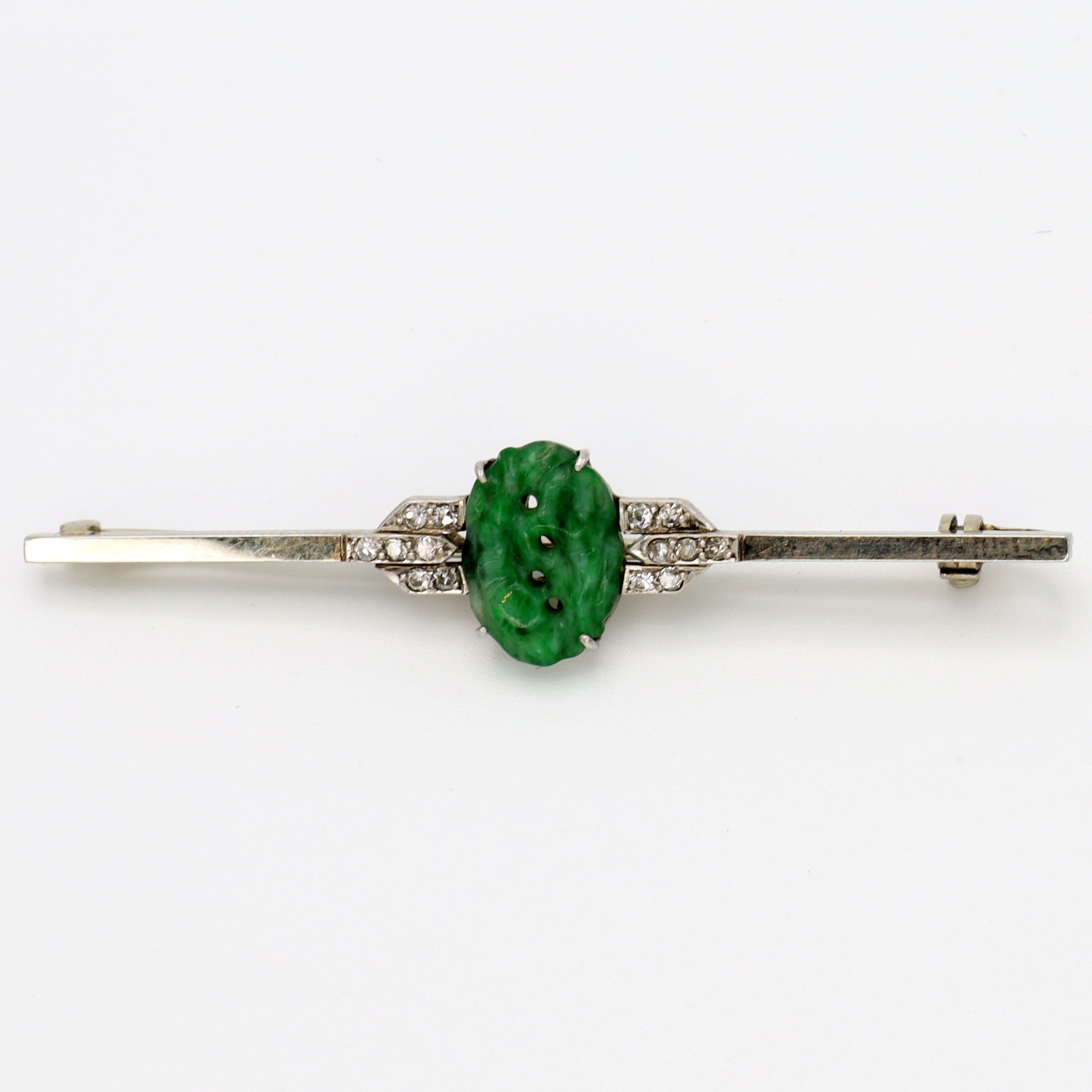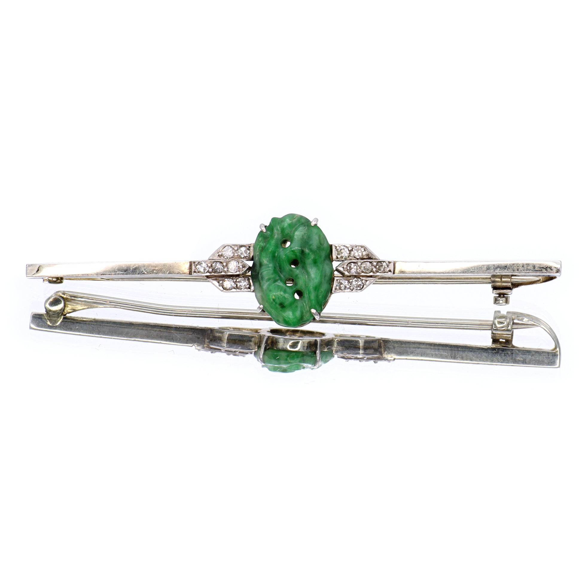 Estate Jadeite Carved Art Deco Platinum and Diamond Brooch
