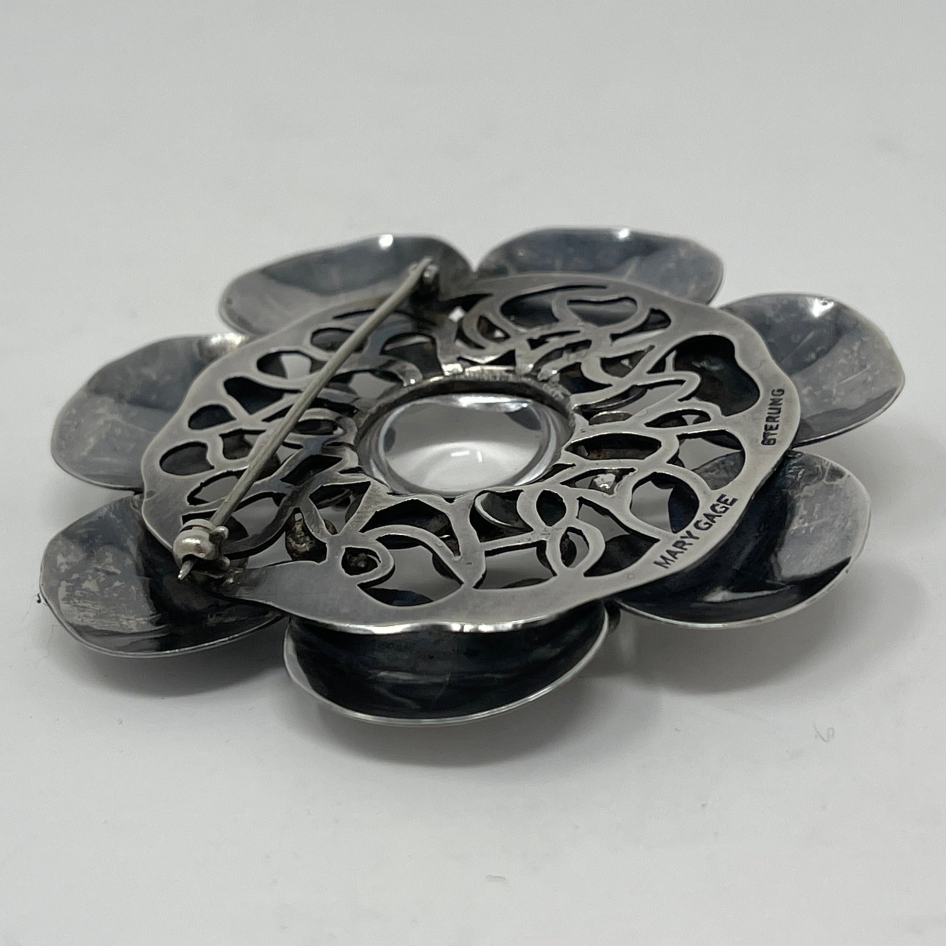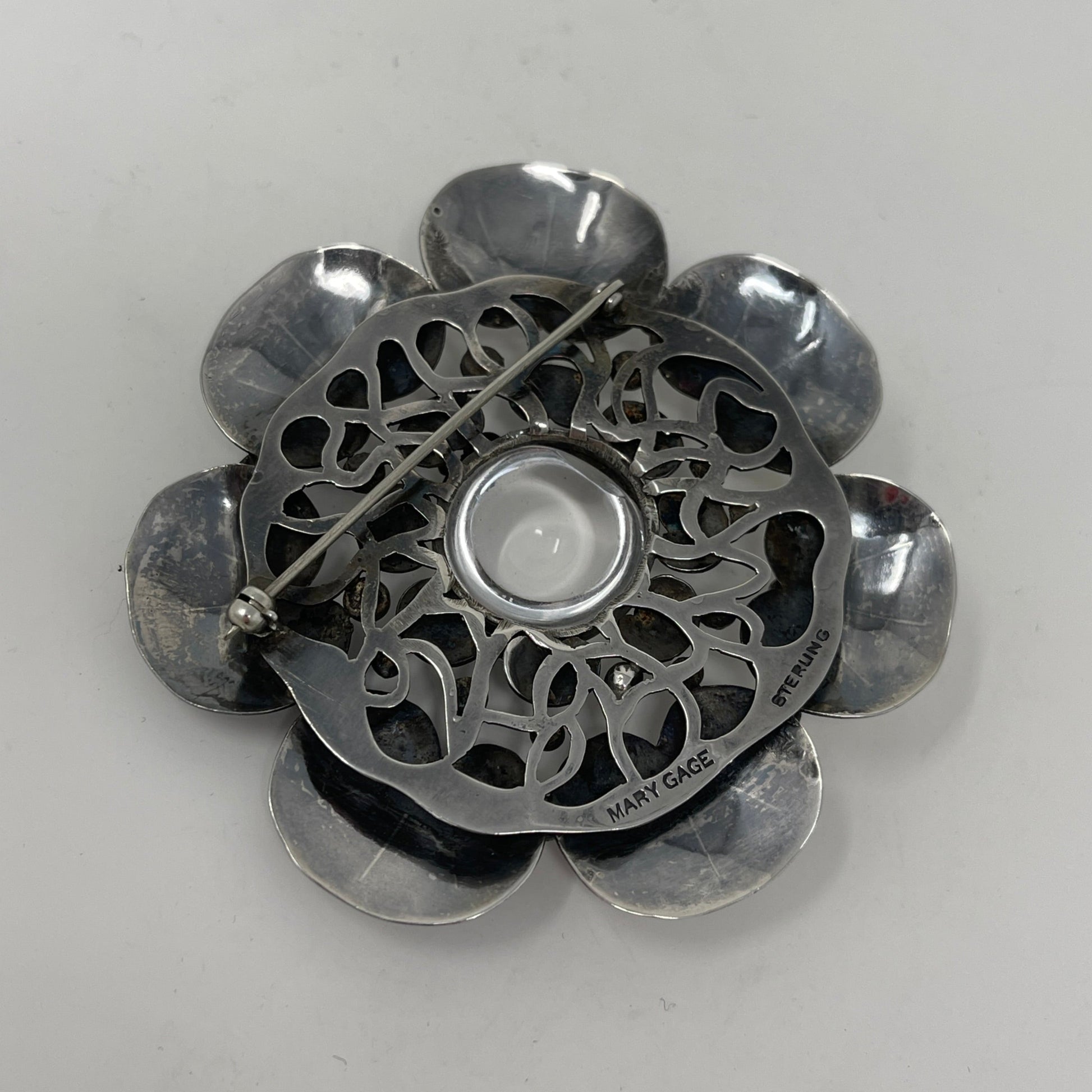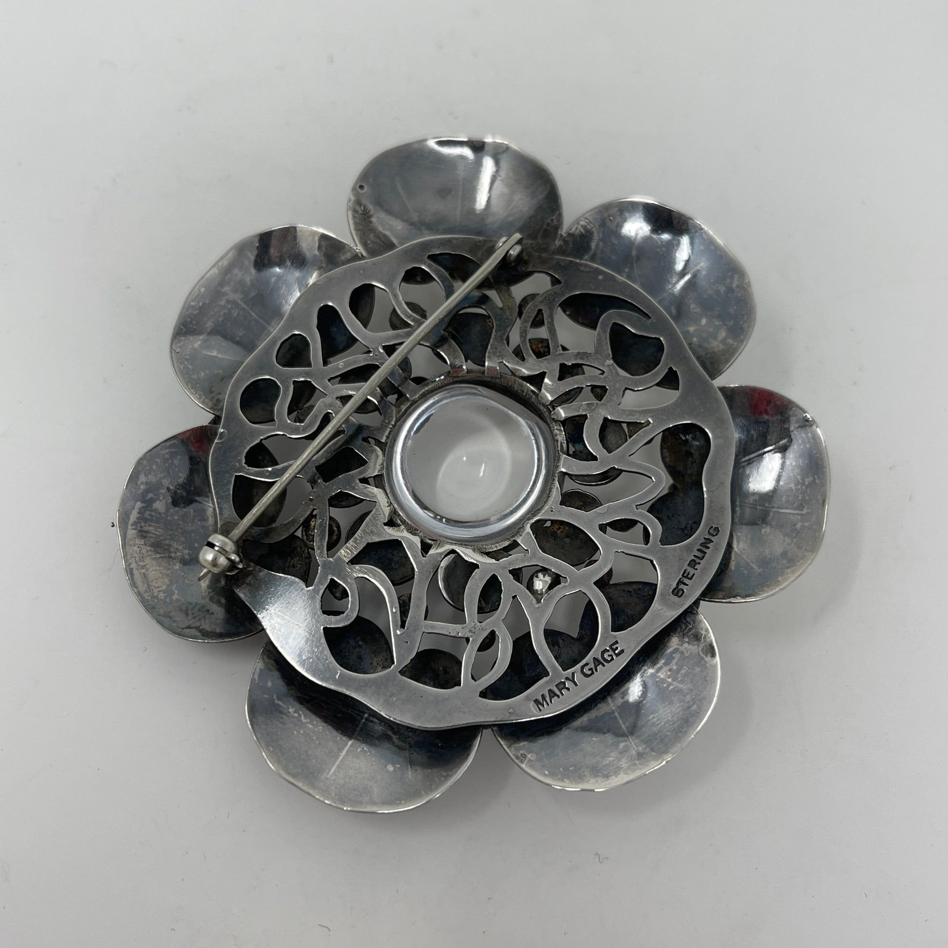 Estate Mary Gage Sterling Silver and Crystal Quartz Cabochon Modernist Lilypad Brooch