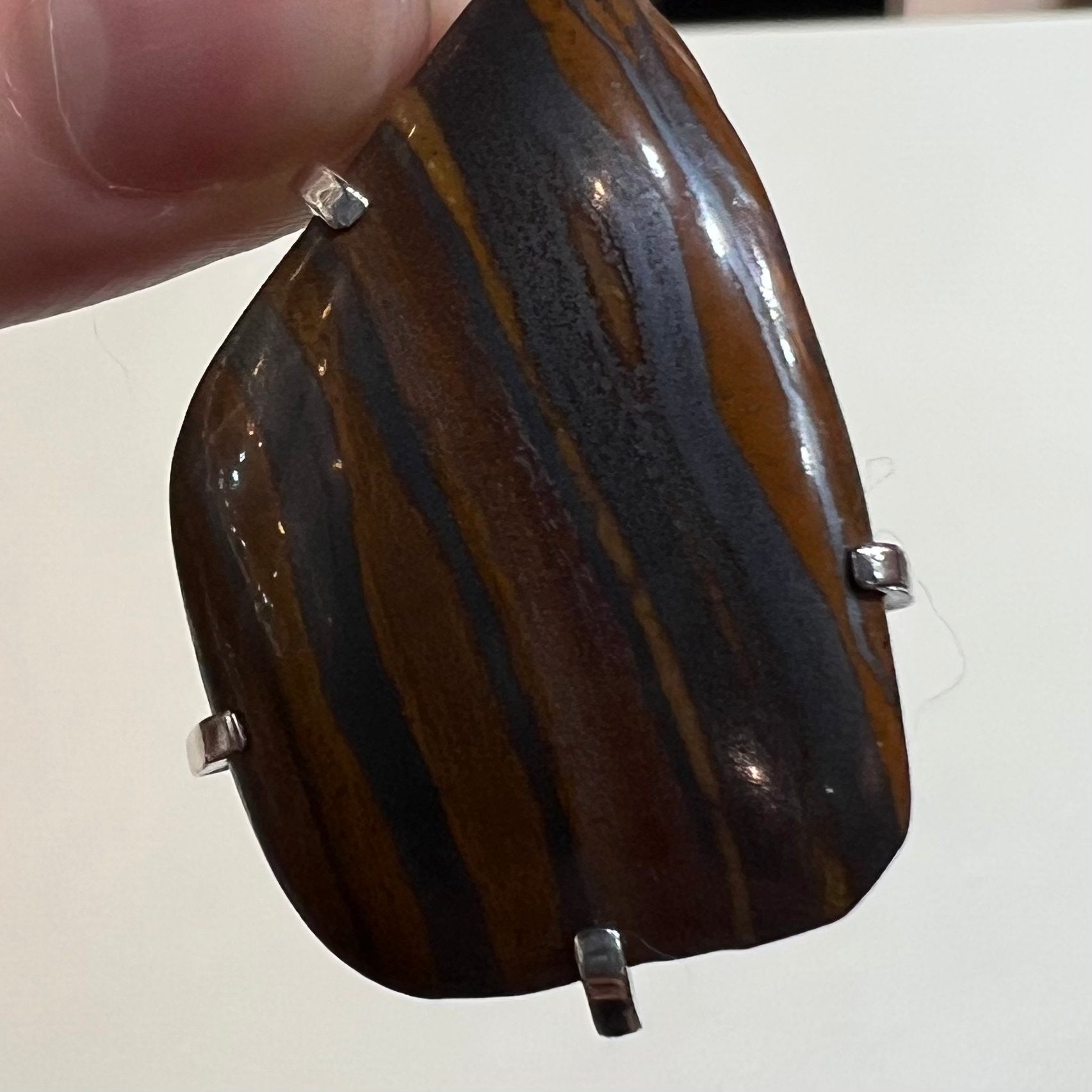 The pendant features a breathtaking natural stone with an amorphic shape resembling a river rock.