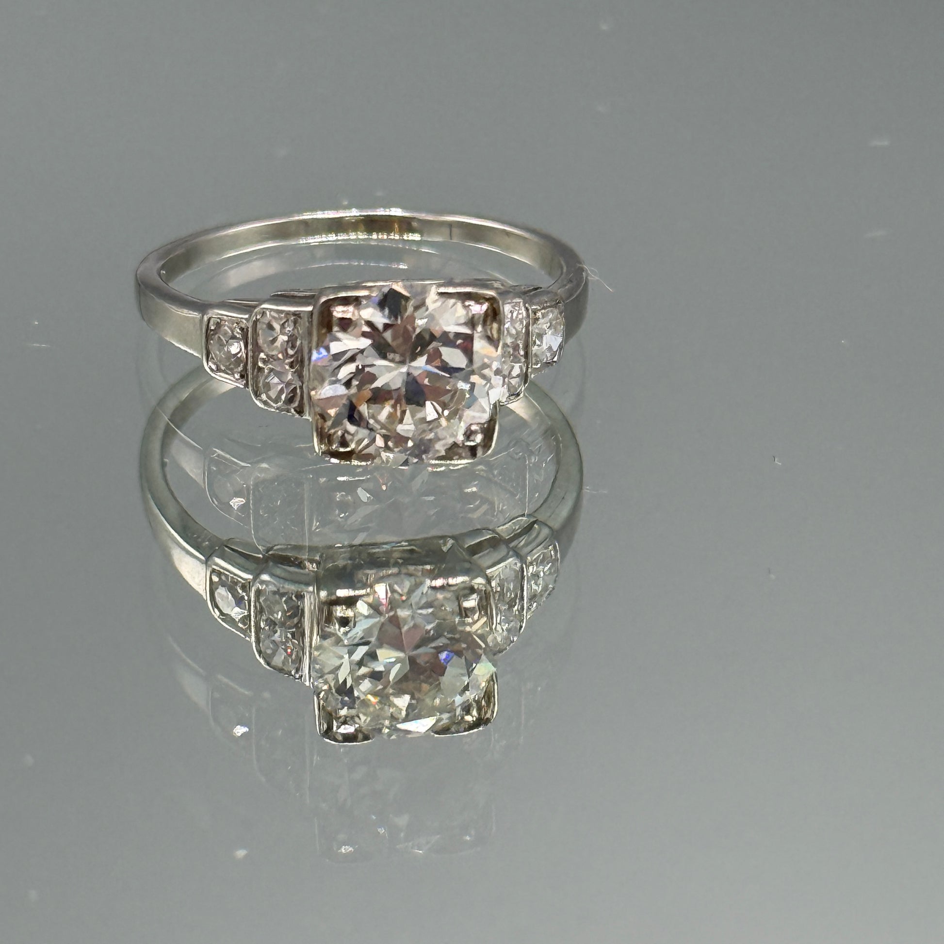 A timeless platinum setting showcasing a brilliant round diamond at its heart, complemented by three precisely matched round diamonds flanking each side for enhanced sparkle and sophistication. Center stone transition round brilliant color HI and SI 1 and total of 1.4 carats. Side stones single cut GH color SI 1-2 total weight 0.24 carats.