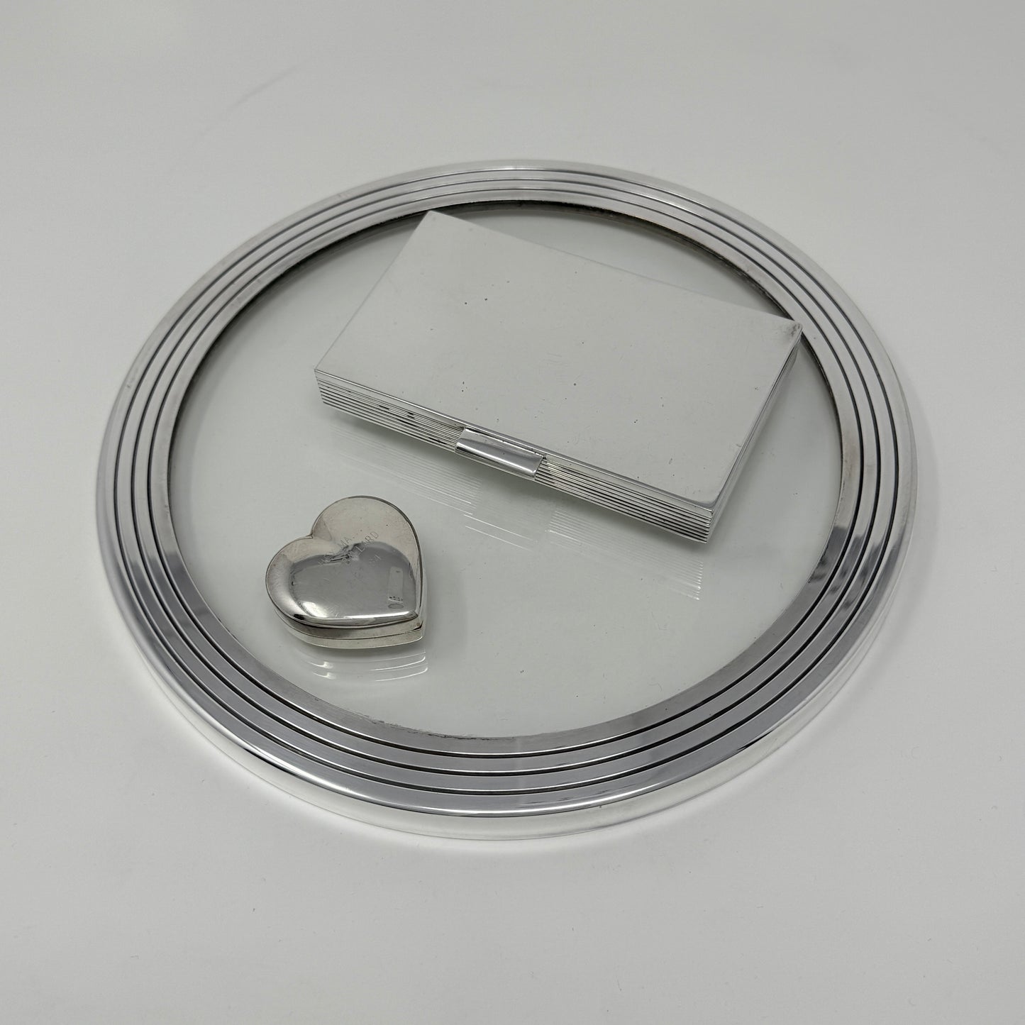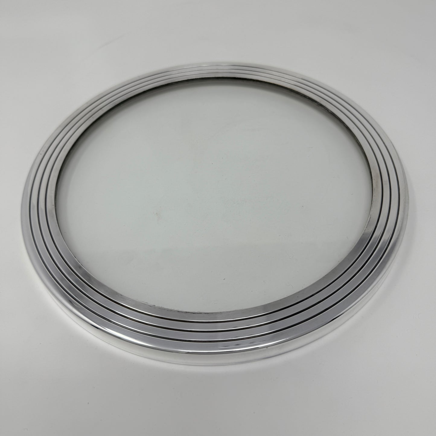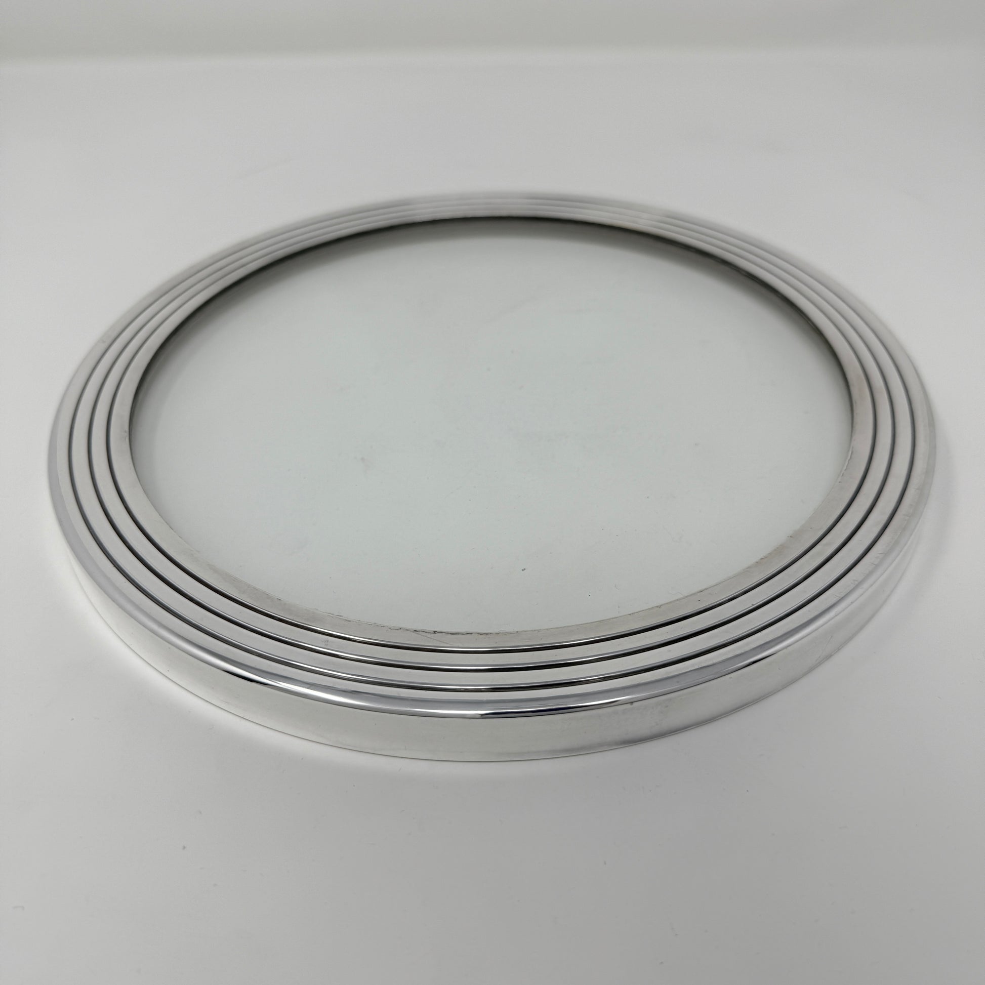 Glass insert in stepped heavy base. Perfect for small objects or vase. Excellent condition with no signs of wear.