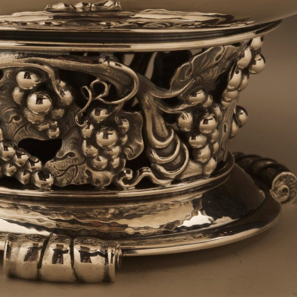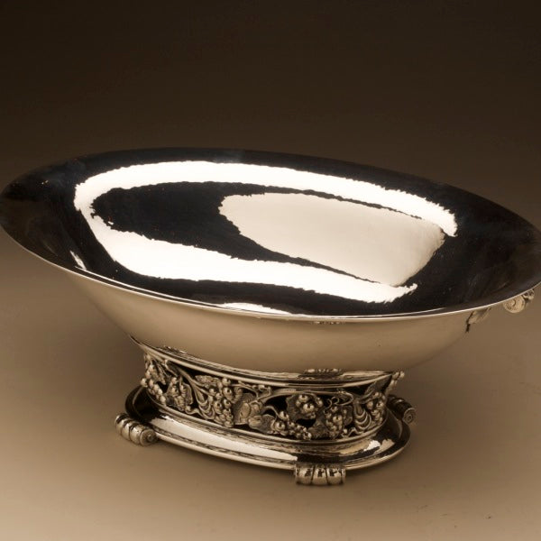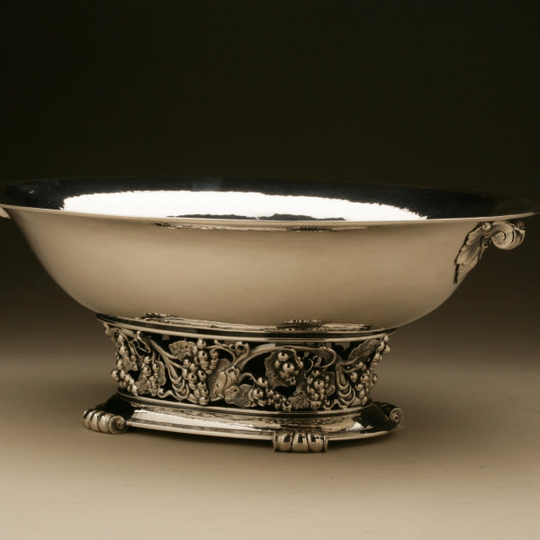 Spectacular oval centerpiece bowl by Evald Nielsen mounted on gallery comprised of grapes and grapevines with stepped base and scrolled feet.