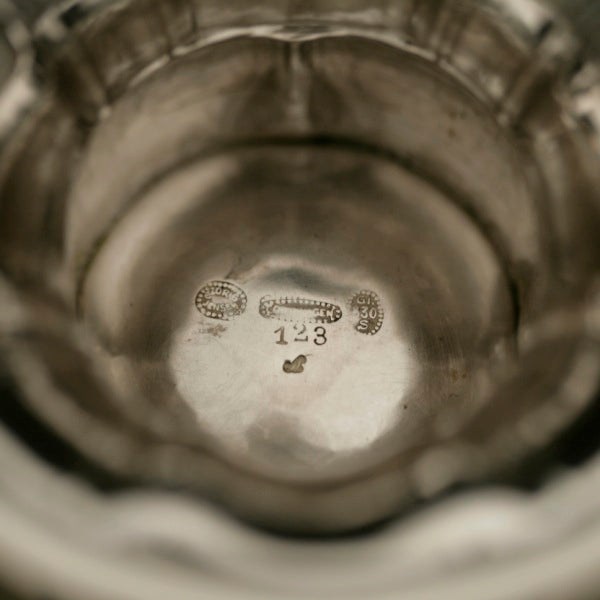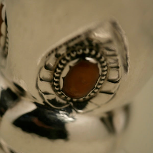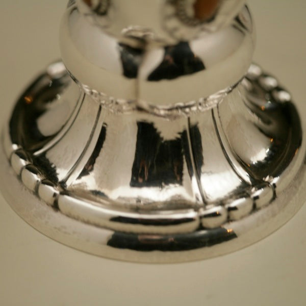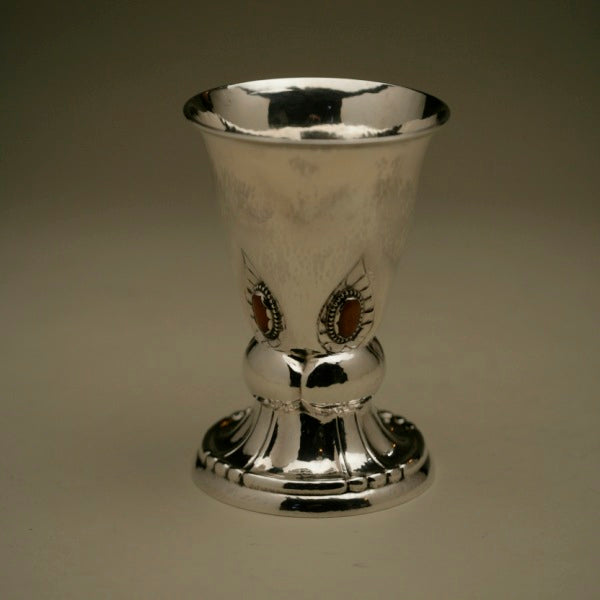 Ornate cup with stepped base. Features beautiful amber stones and lipped rim. Hallmarks from 1915-1919, 830S.