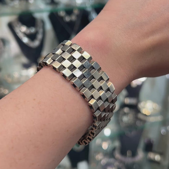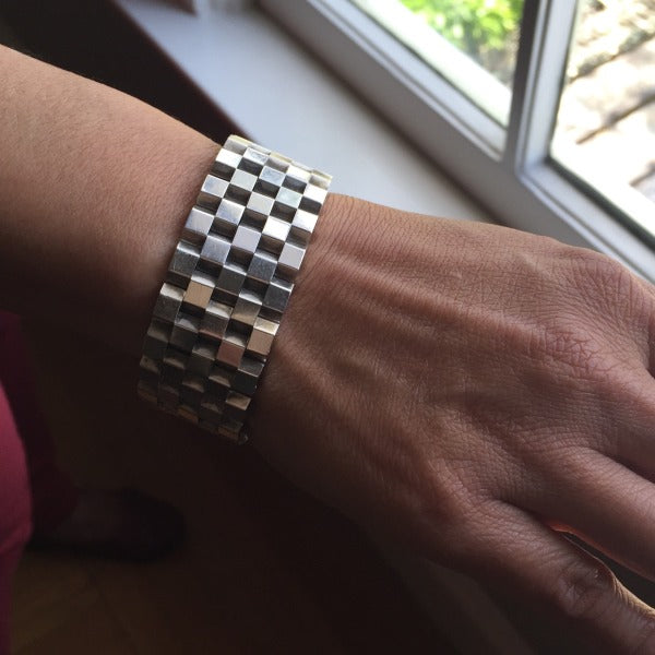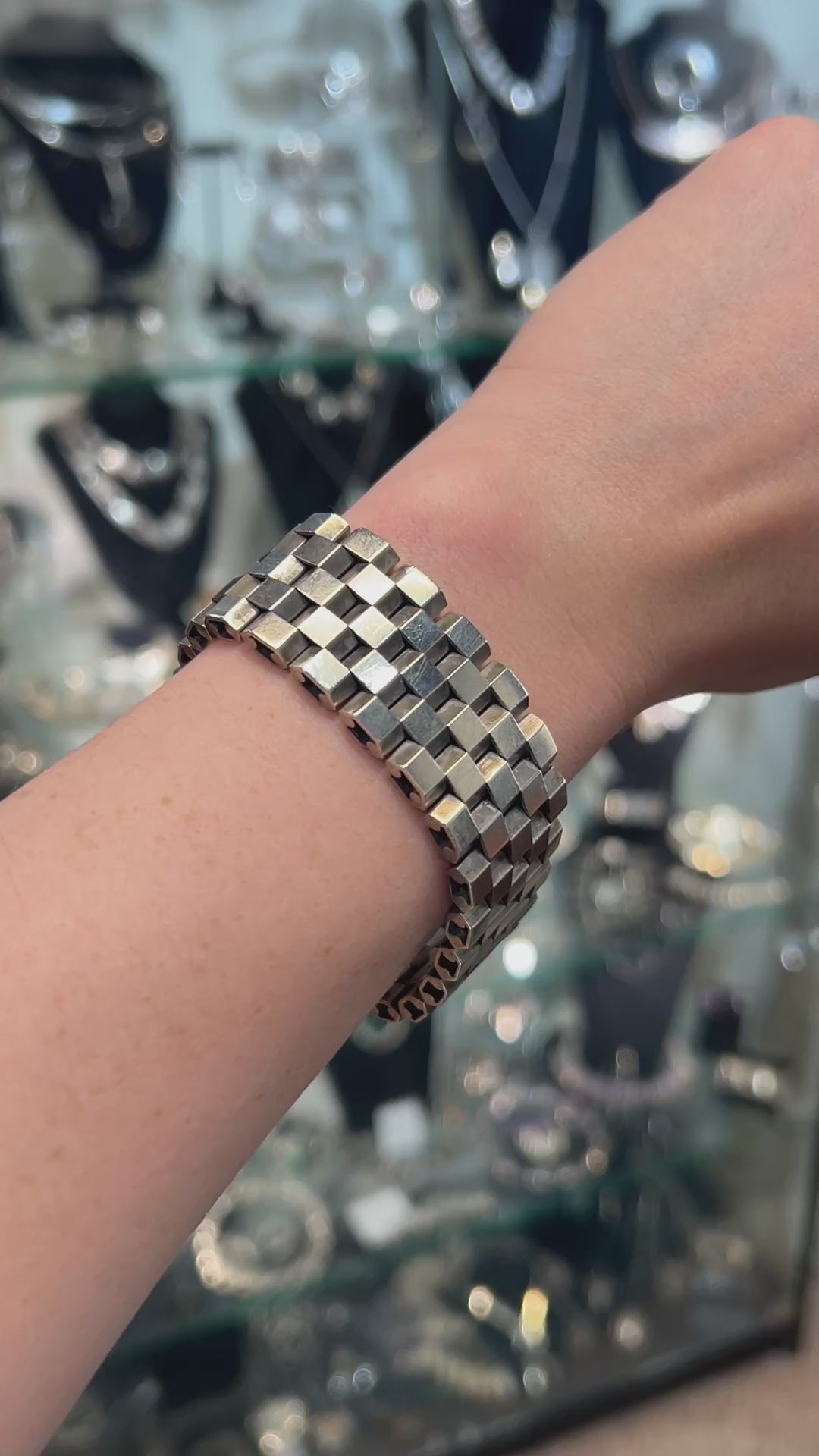 Spectacular “checkerboard” visual created by intricate, alternating squares of sterling silver.