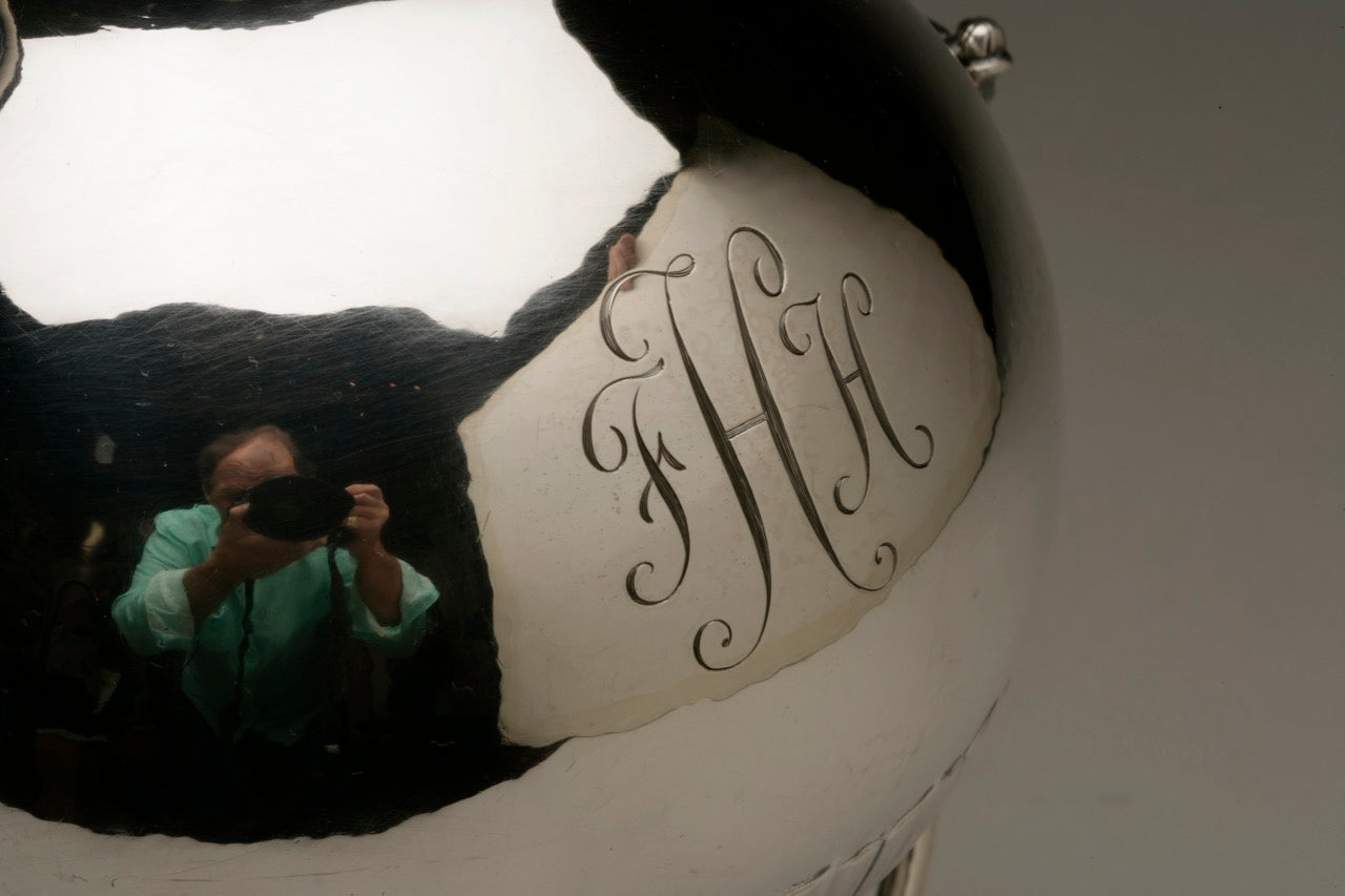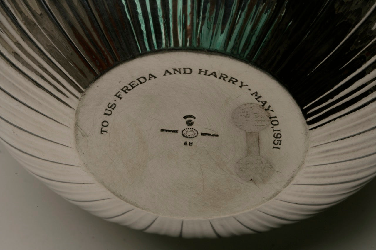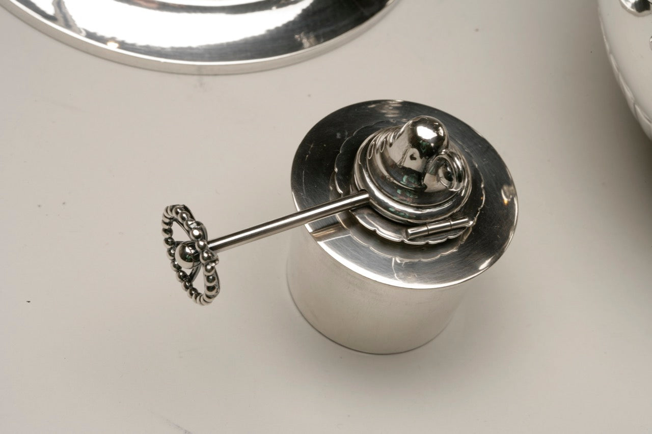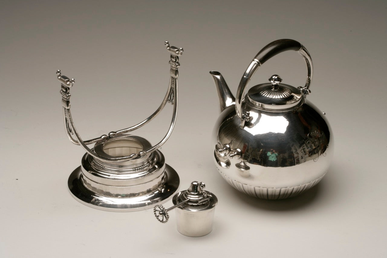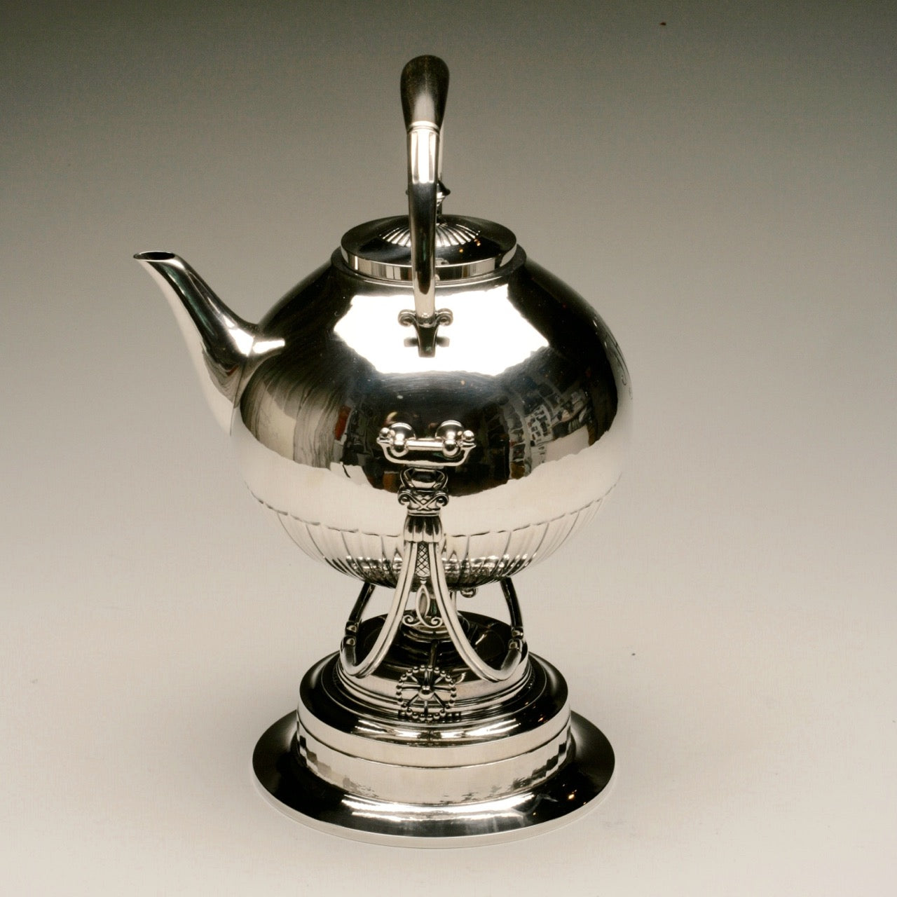 Sterling silver tea kettle with stand and burner, ebony handle. Designed by Johan Rohde.
