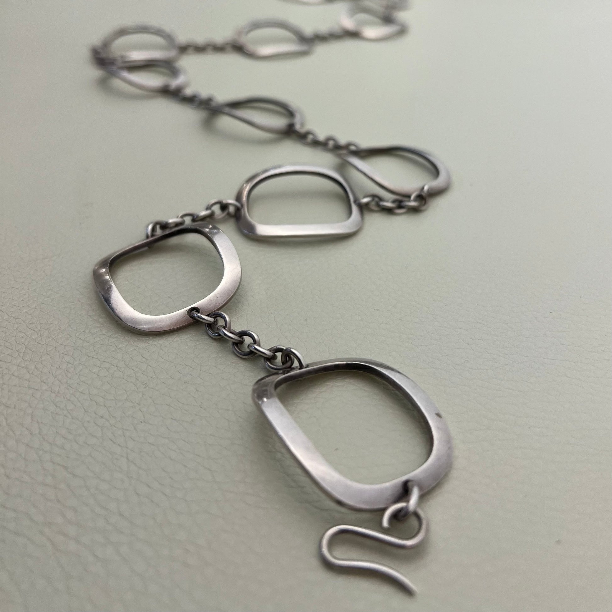 It is comprised of 13 rectangular domed handmade links. 33" total length. Hook clasp.
