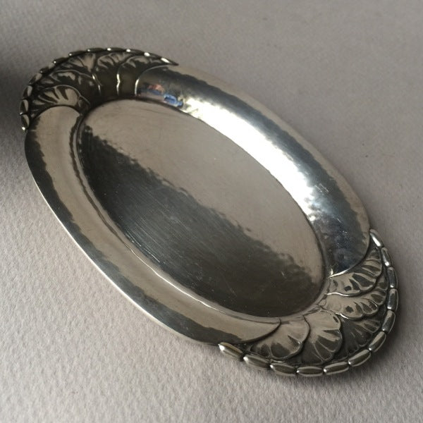 The oval tray has similar foliate details with beaded edge on two sides with hallmarks from the 1930's.