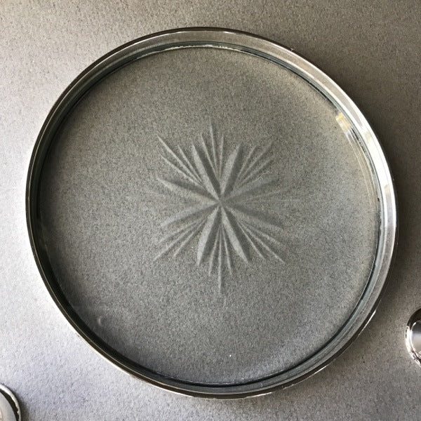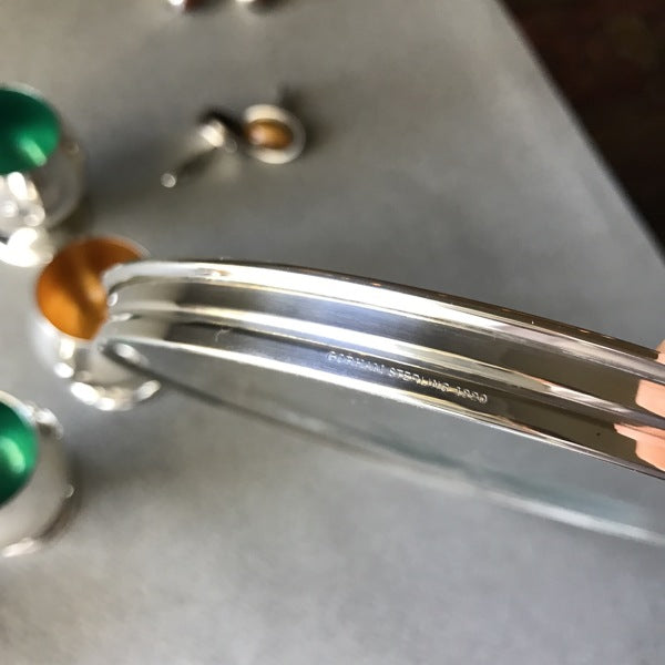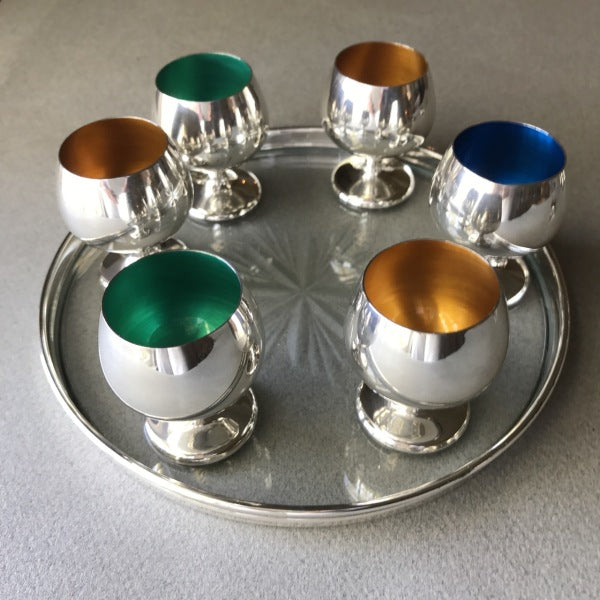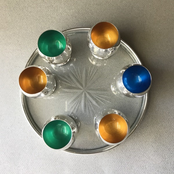1960's "Jet Set" drinks set consisting of a sterling silver rimmed glass tray and six enameled cups. The tray with a cut glass base and the six sterling silver cups with enameled interiors in aqua, yellow or blue All made and marked by Gorham and date from around 1965.