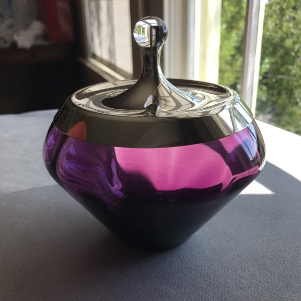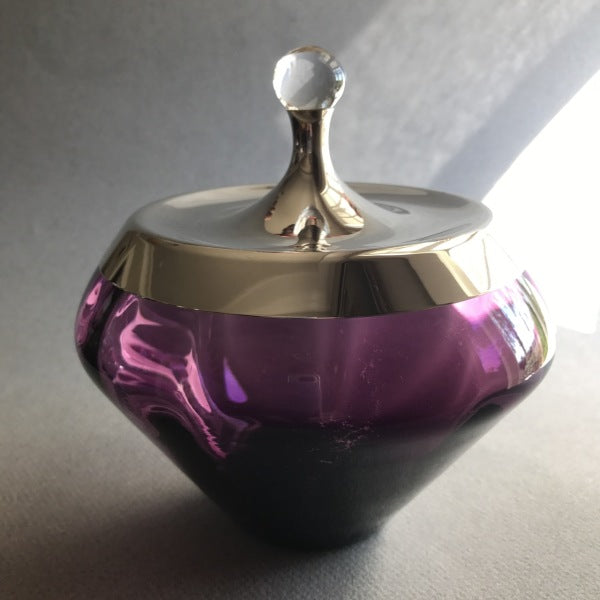 Round tapered amethyst glass dish with sterling silver lid made by Gorham Manufacturing Company. First introduced in 1963. This sterling silver lid is topped with a clear glass finial. Glass and silver elements in perfect condition. The amethyst glass was made by Lindshammar Glasbruk in Sweden.