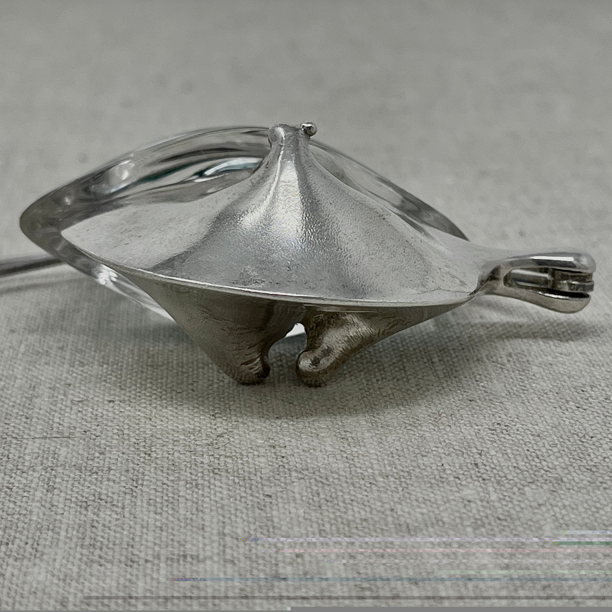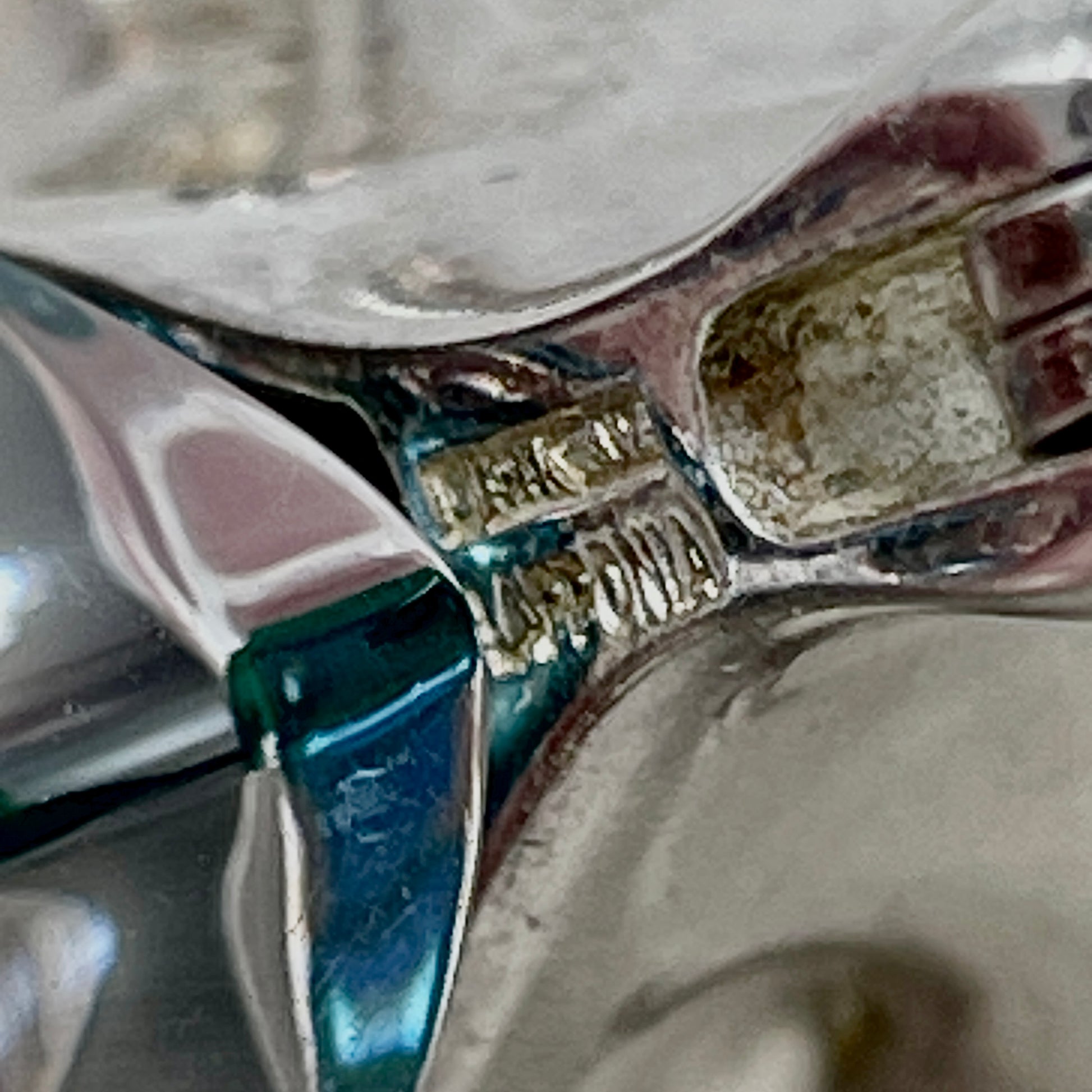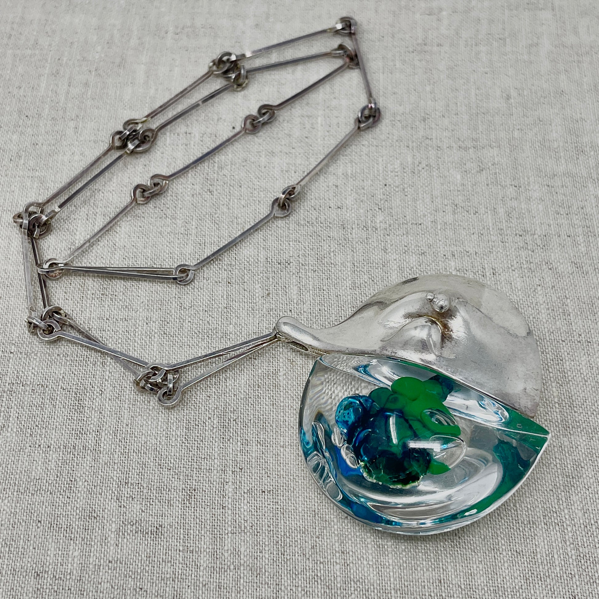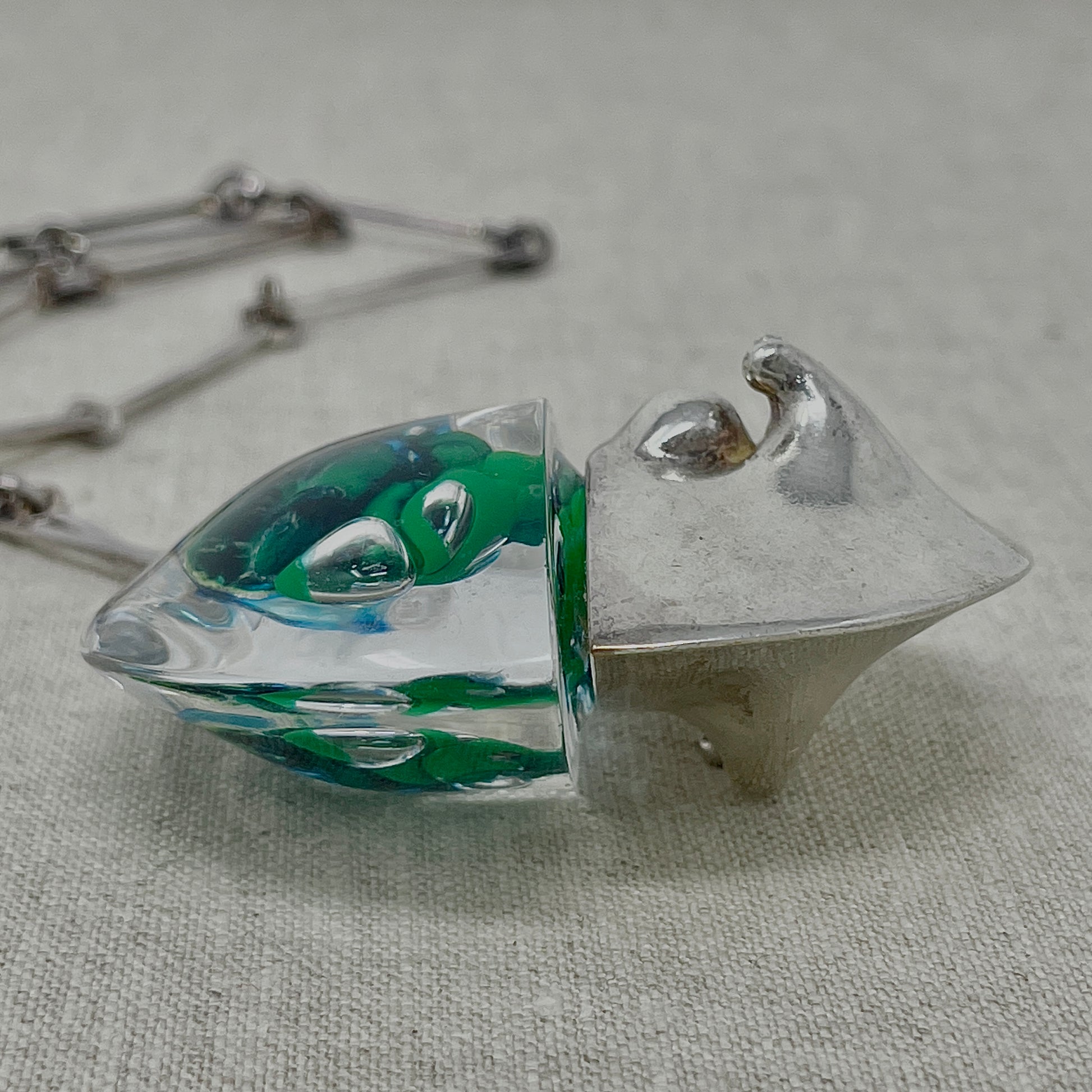 A geometric, undulating silver section with space influences characteristic of Weckström’s designs comes together with a large acrylic drop encapsulating vibrant green and blue and clear bubbles. Featured on a matching handmade sterling silver link necklace measuring 26.5" inches total length.