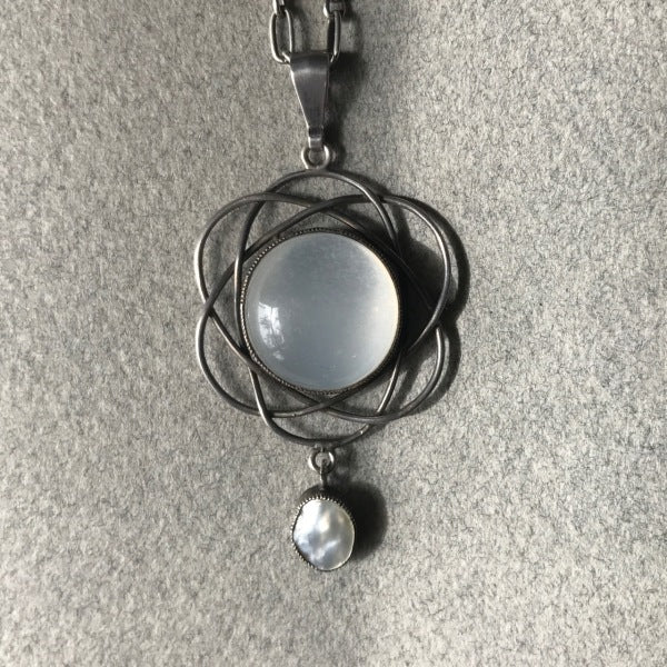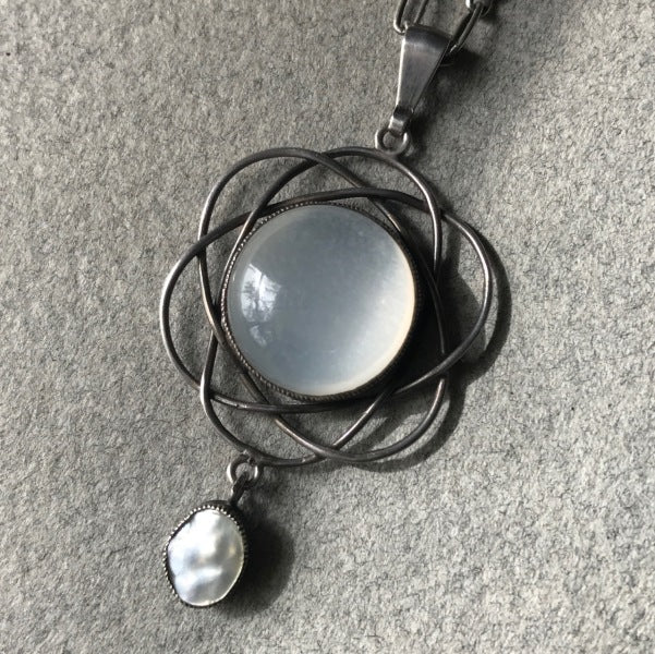 Polished moonstone pendant in a filigree mount further enhanced with a natural pearl drop.