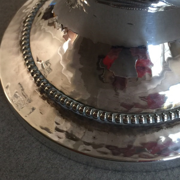 This genie lamp has wonderful, stylized details and an edged foot with beading. It has an inscription from 1935. This oil lamp is 826 Silver which dates it to approximately 1915.