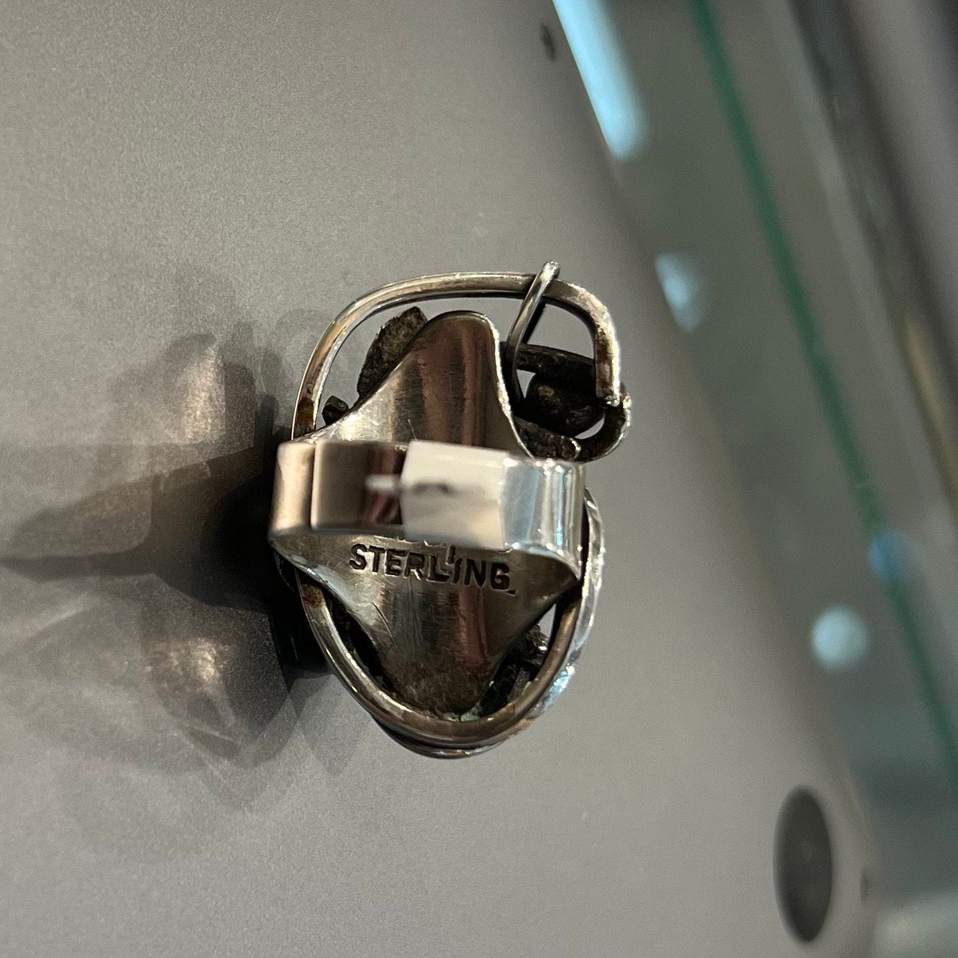 Adjustable, hand wrought, one of a kind brutalist design ring made by Rebajes. This artist frequently worked in copper, so it is rare to see pieces in sterling. Rebajes studio featured pieces in a well known shop on 5th Avenue in NYC in the 1950’s and 1960’s in addition to being featured in museums.