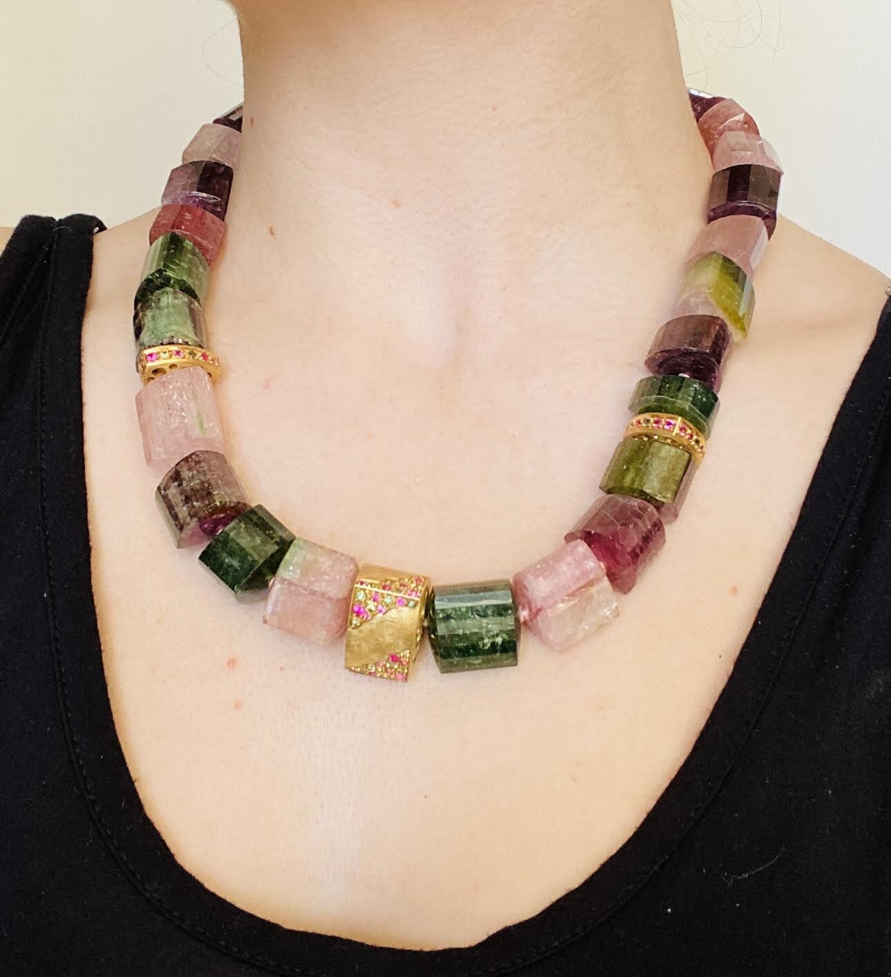 Length: 21 inches; Materials: 18K Yellow gold, pink and green sapphires, tourmaline.