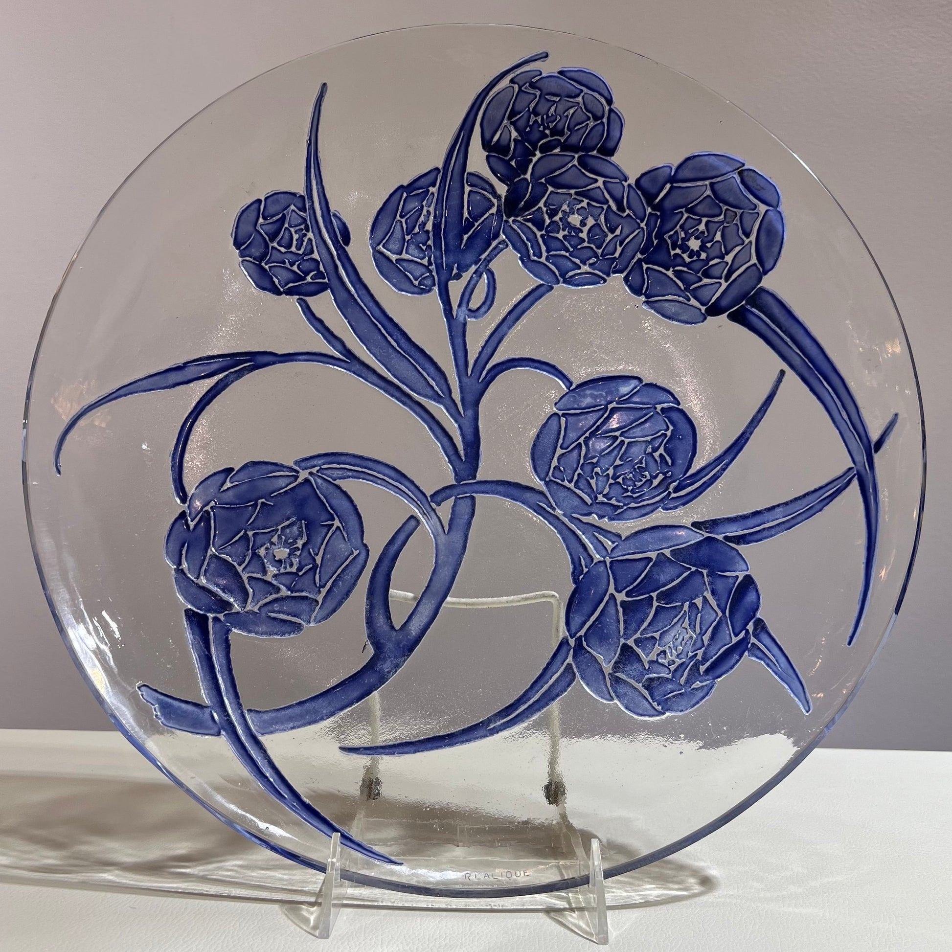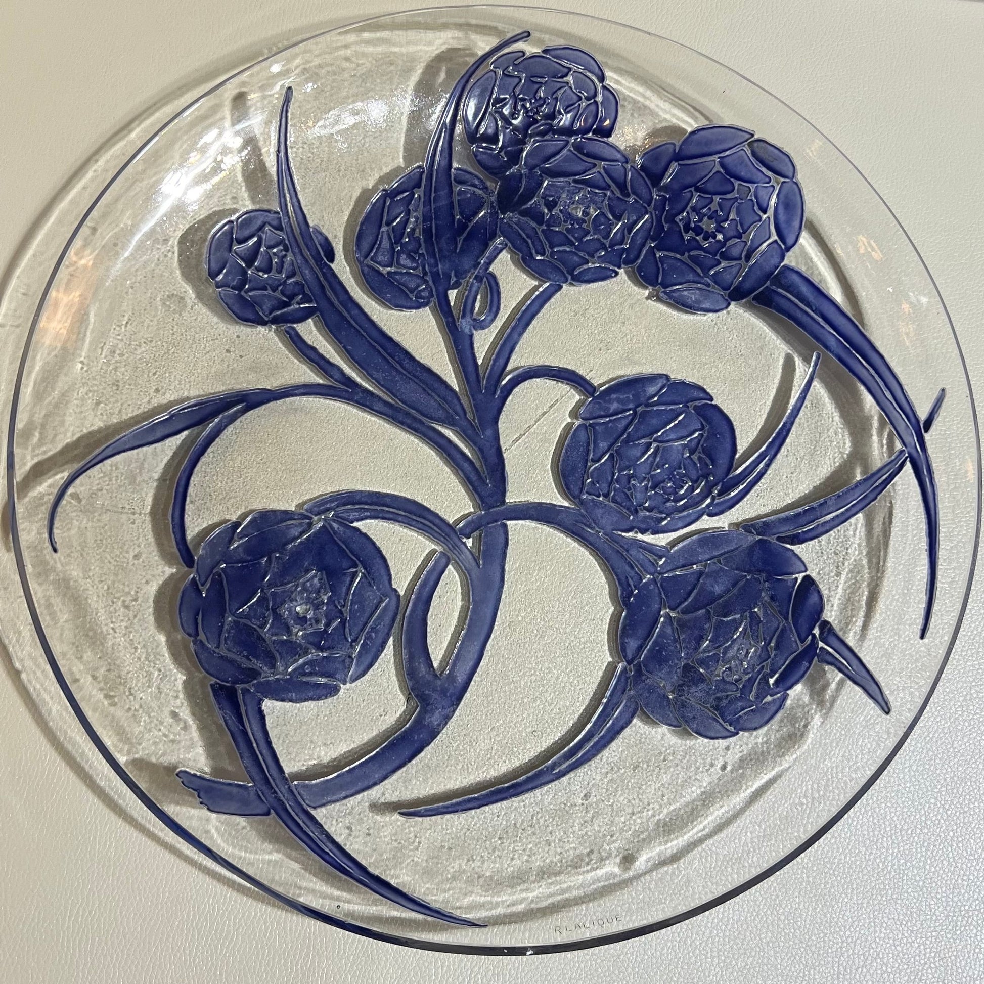 René Lalique Peonies Centerpiece Platter with Tanzanite Colored Blue Flowers