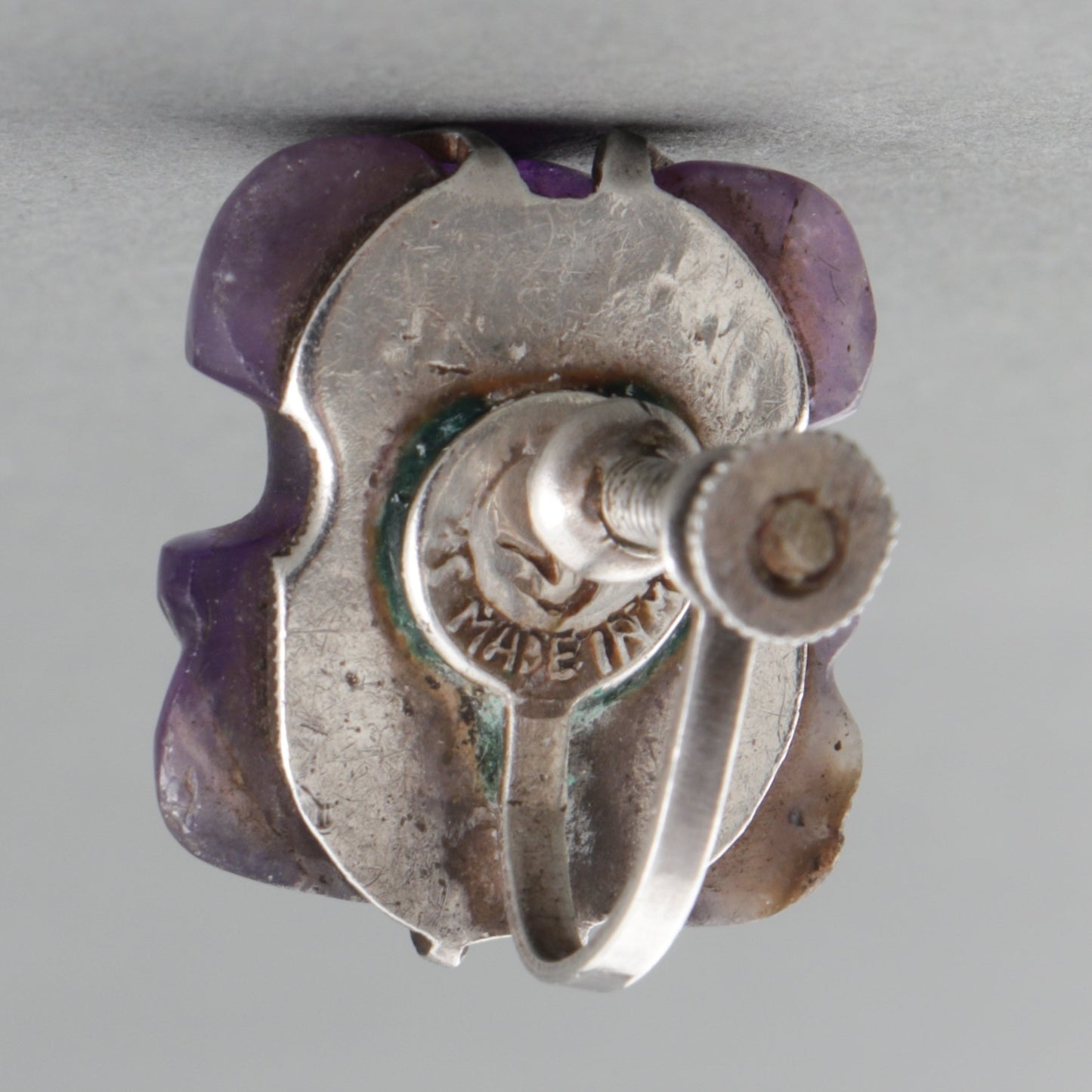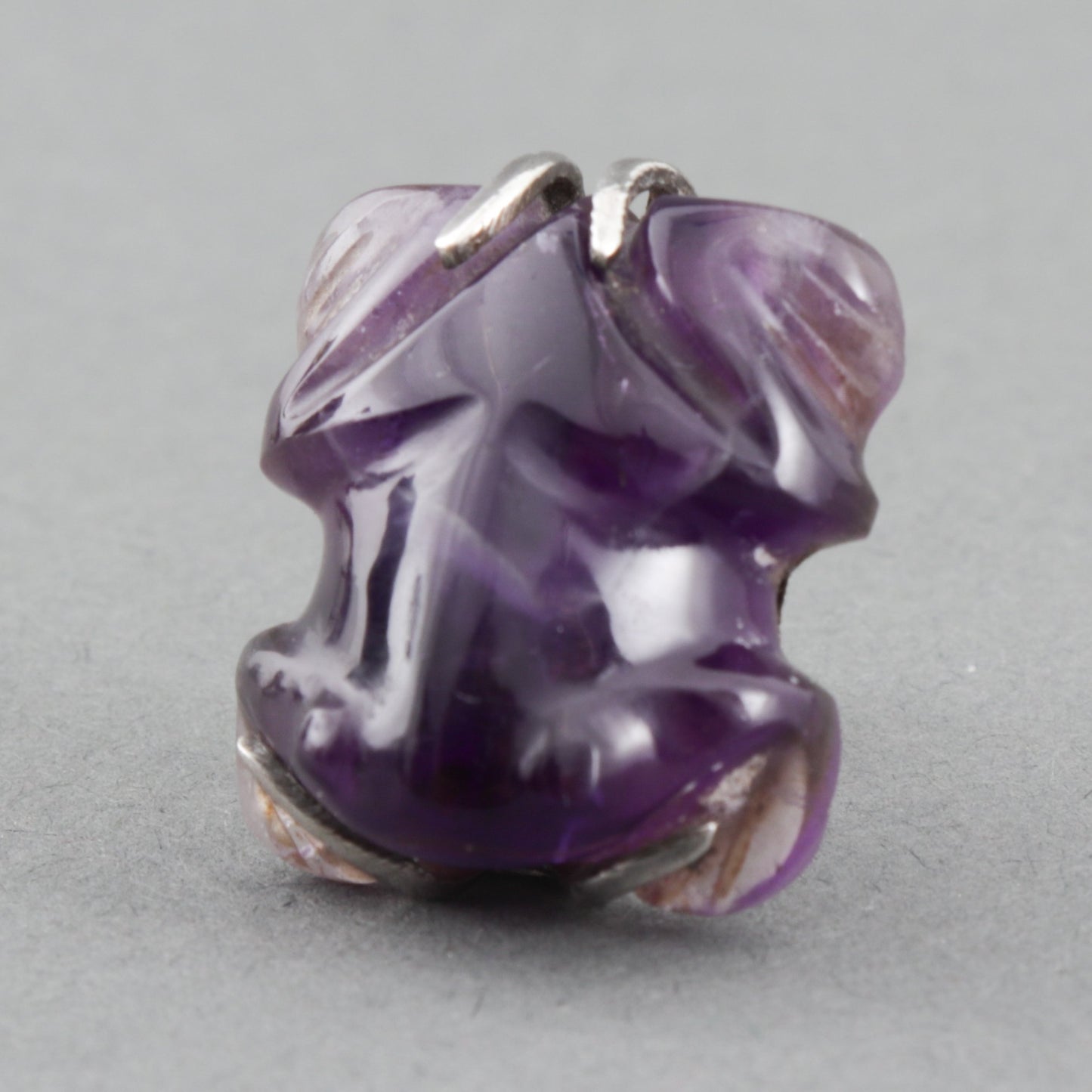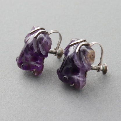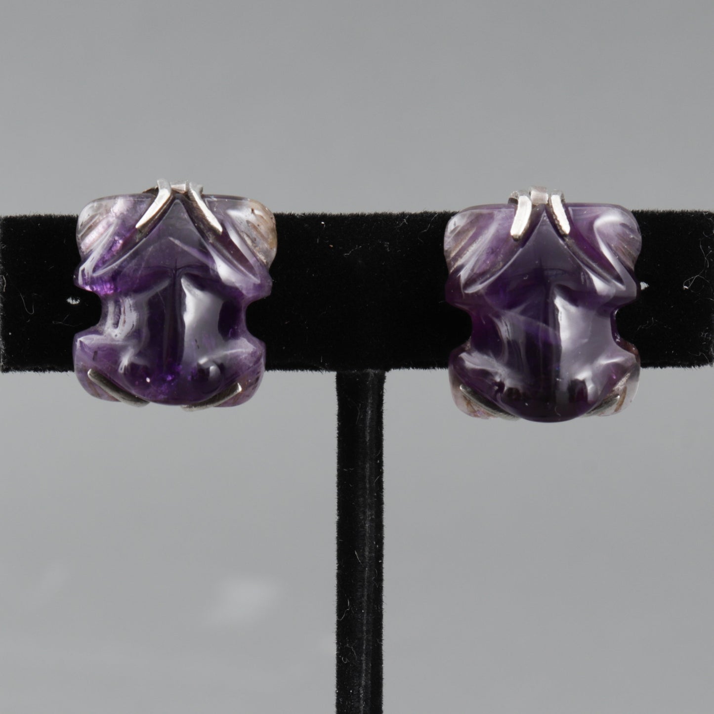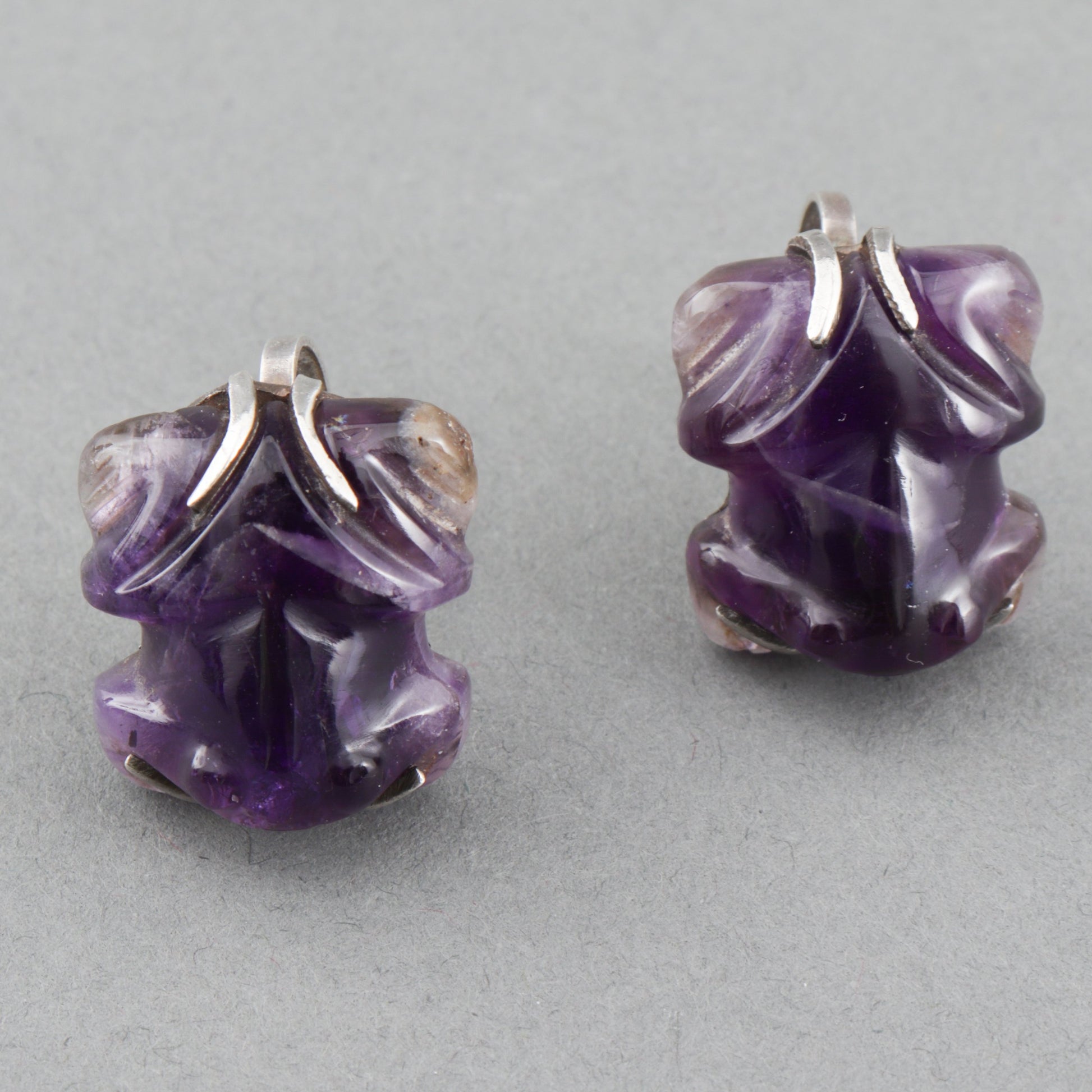 Designed with carved amethyst frogs in a silver screw-back setting.