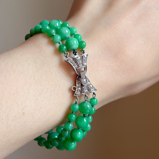 Edwardian Triple Strand Jadeite Bracelet with Platinum & Diamond Clasp