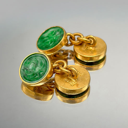 Antique 24kt Gold Deep Apple Green Jadeite Qing Dynasty Double Sided Cufflinks